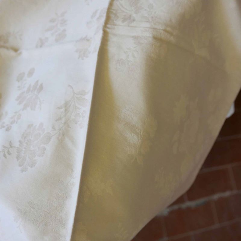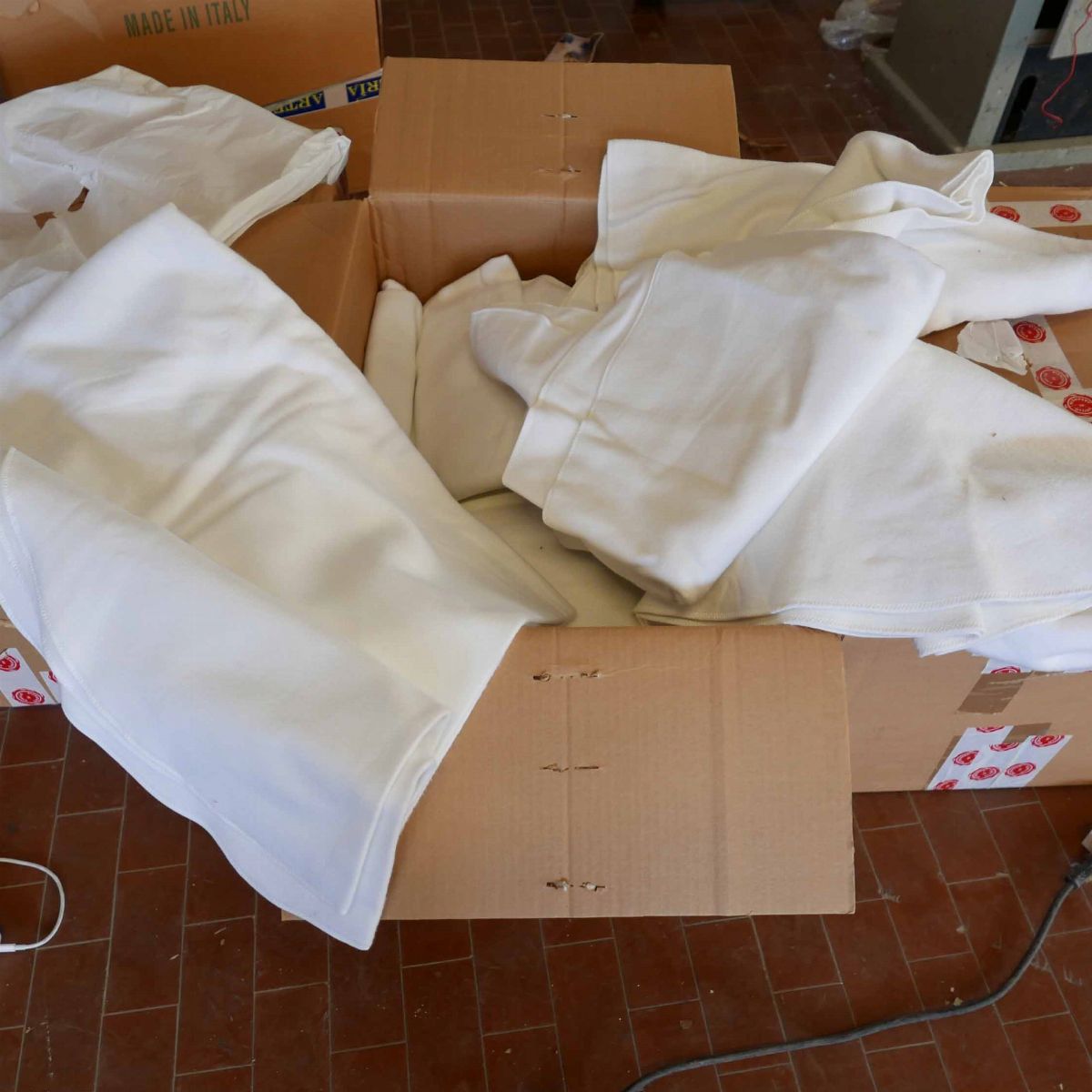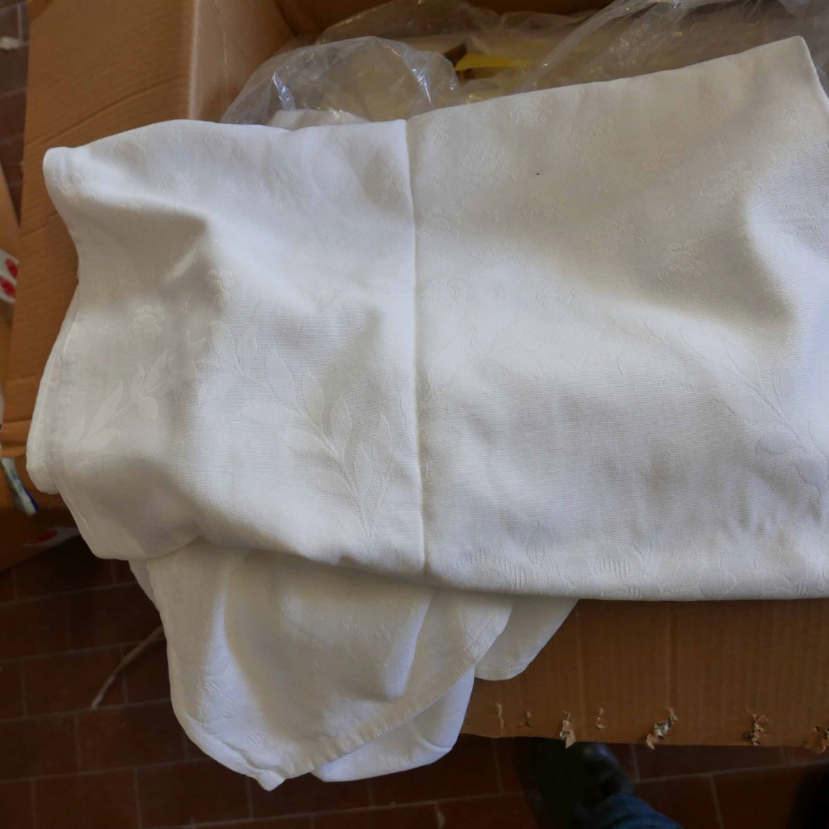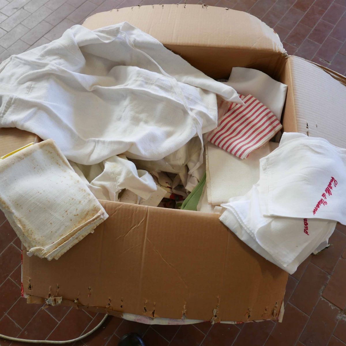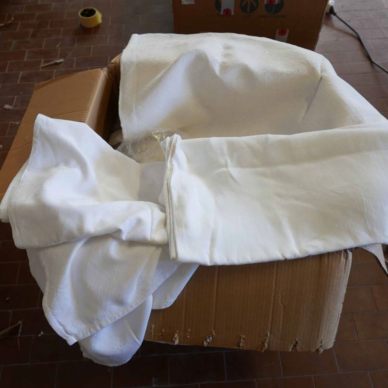 una contenente mollettoni rotondi di varie dimensioni, una tovaglie bianche di varie dimensioni, una strofinacci e grembiuli e una stoffe varie.