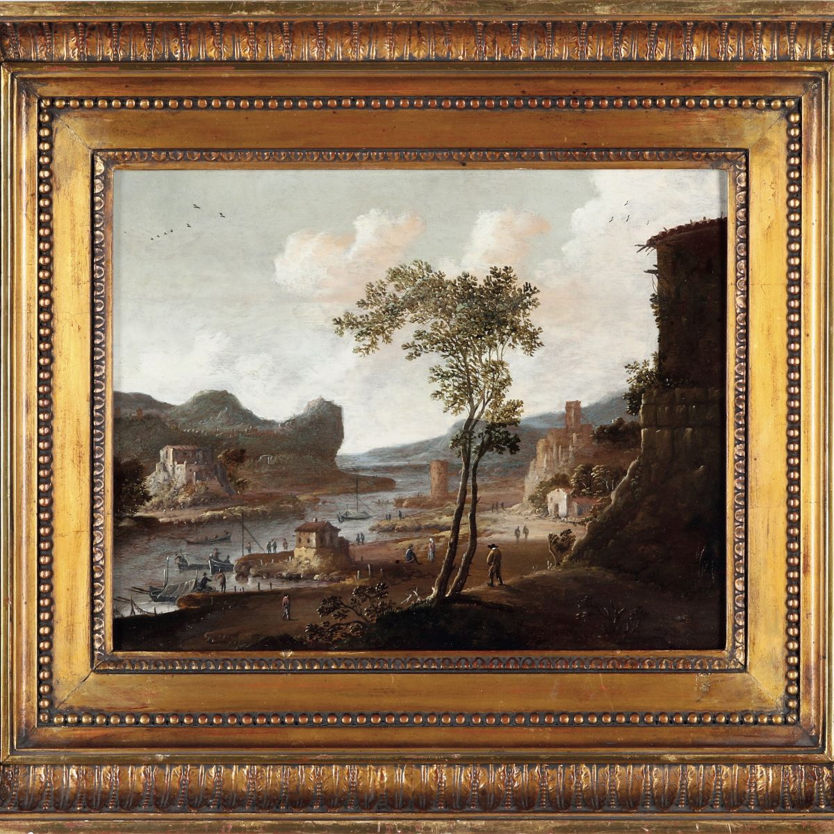 Paesaggio fluviale con rovine e imbarcazioni