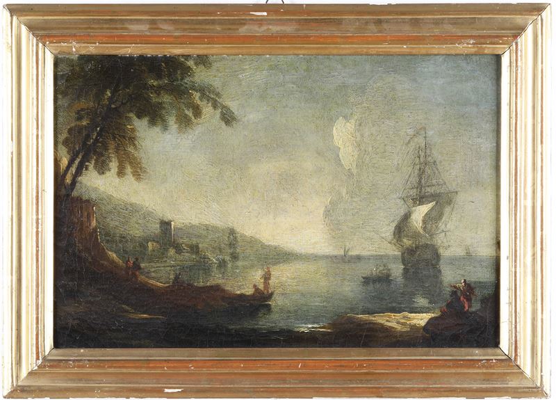 Scuola veneta del XVIII secolo Vedute costiere con figure e velieri