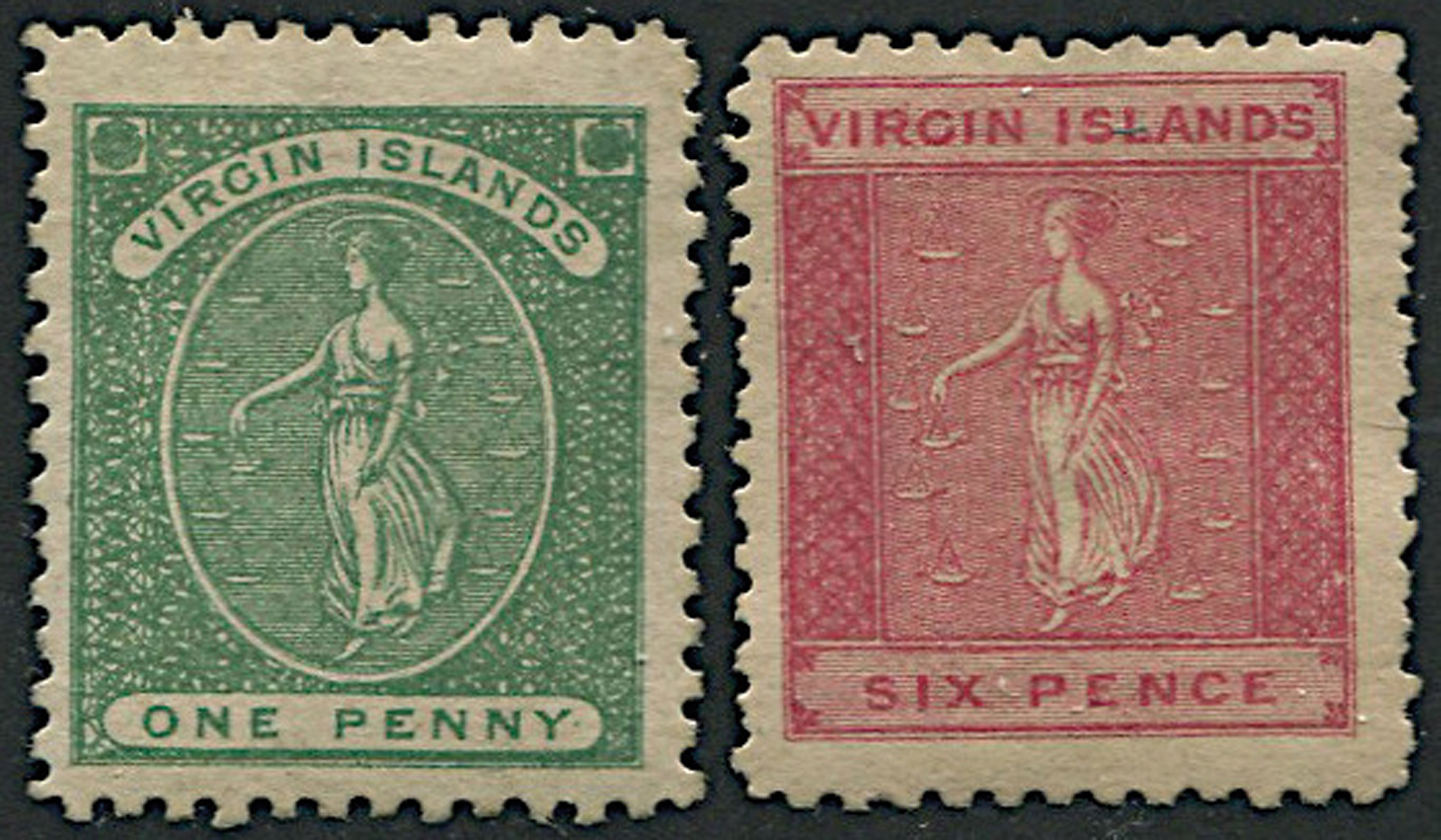 Toned paper, 1 d. green an 6 d. rose-red (S. G. 5, 7), unused.
