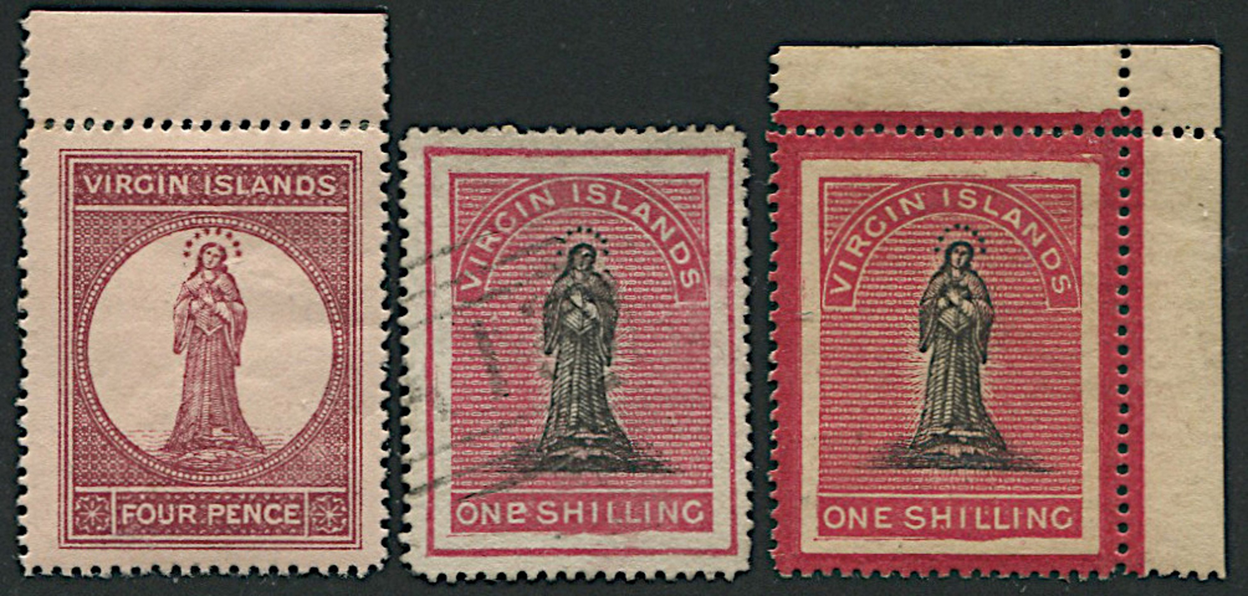 4 d. lake red (S, G. 15) new; 1 s. black and rose (S. G. 18) used; 1 s. black and rose with frame lines retouched (S. G. 21) new. The 4 d. signed A. D.