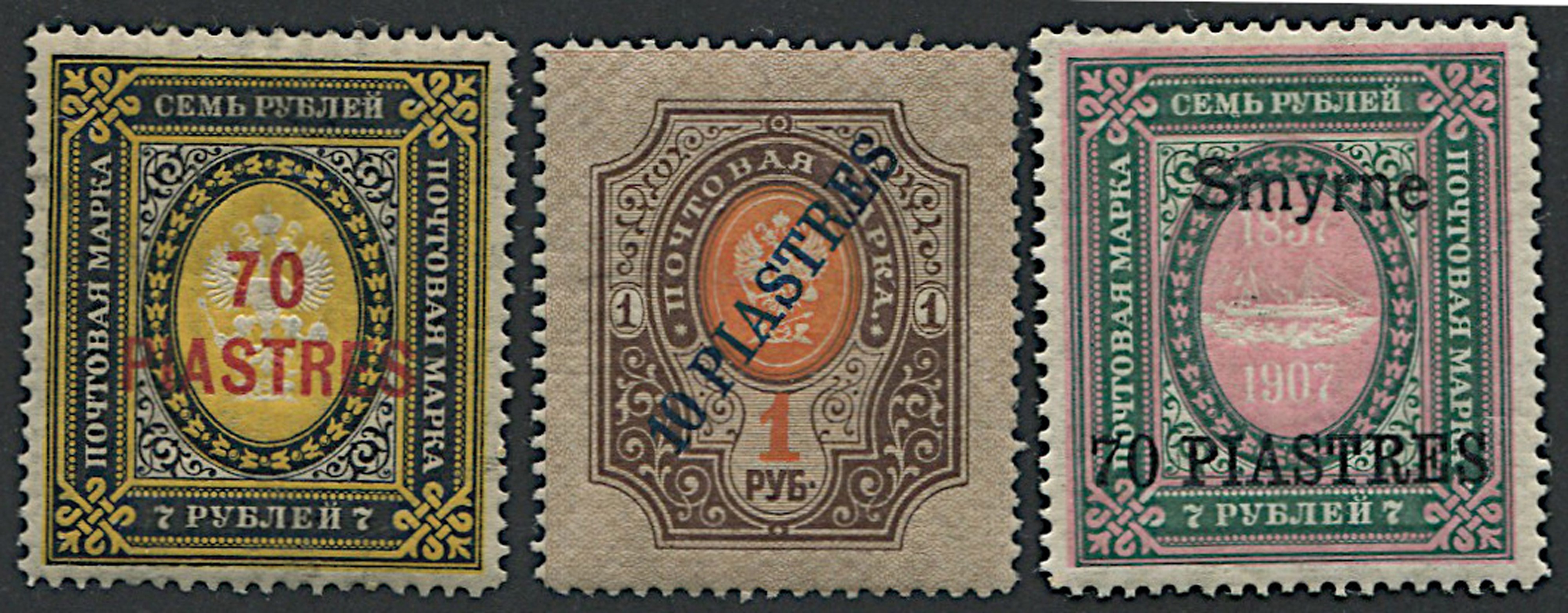 3 values horizontal laid paper (Yv. 26/28); 10 values vertically laid paper (Yv. 27A/35); 9 values, ovpt- with new values 8Yv. 36/44); 7 values oblique ovpt. (Yv. 160/166); 9 values with names of various cities ovpt.: “Costantinople” (Yv. 54/62) and “Smyrne” (Yv. 142/150), hinged. Very fine.