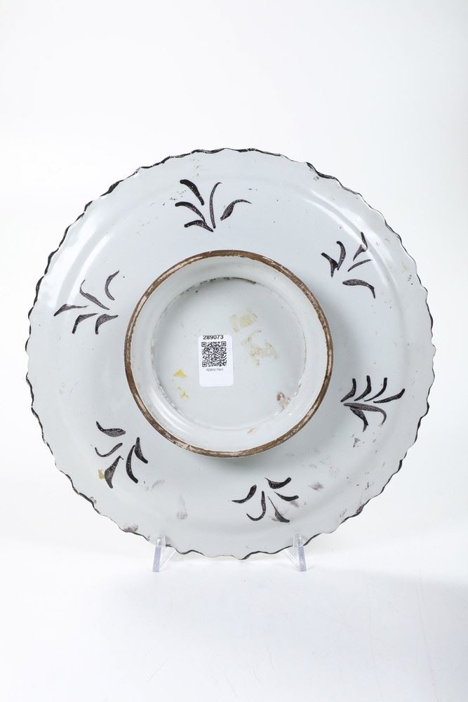 Maiolica decorata con colori a gran fuoco. Marca assente. Dimensioni: altezza cm 4,6; diametro cm 31. Conservazione: ottima; minime sbeccature al bordo