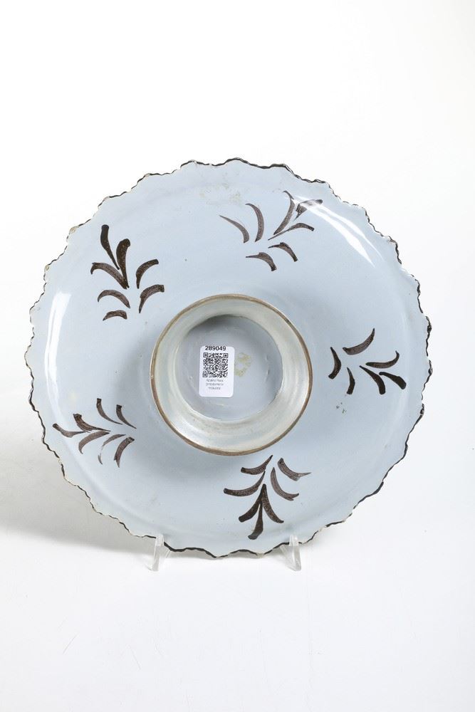 Maiolica. Marca: assente. Dimensioni: altezza cm 4,2 circa; diametro cm 30,5. Conservazione: ottima; insignificanti salti di smalto al bordo; piede moderno integrato