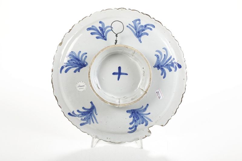 Maiolica decorata con colori a gran fuoco. Marca assente. Dimensioni: altezza cm 4,8; diametro cm 30. Conservazione: una mancanza al bordo mancanza visibile al bordo e piccole sbeccature
