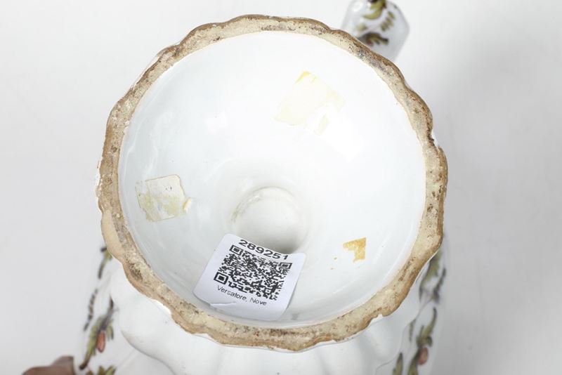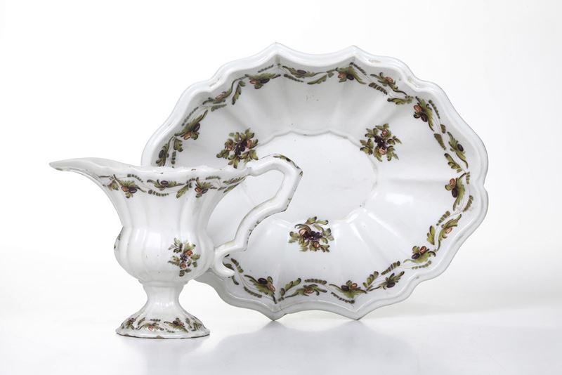 Maiolica decorata con colori a gran fuoco. Marca: assente. Dimensioni: bacile cm 38,2x30,5; versatoio altezza cm 18,2. Conservazione: bacile con sbeccatura al bordo e una piccola felatura; versatoio con corpo ricomposto in restauro