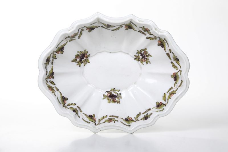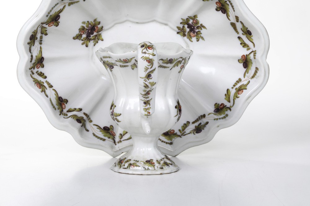 Servizio lavamani composto da vasca e versatoio baccellato in maiolica decorata con un motivo a cornice di linee flessuose con bacche e fioretti fogliati. Le forme sono tipiche della manifattura Antonibon: le stesse forme, ma più asciutte, appartengono alla tradizione aziendale dalla metà del Settecento, ma la severa formula grafica dell’ornato fogliato è di stile tardo, storicista