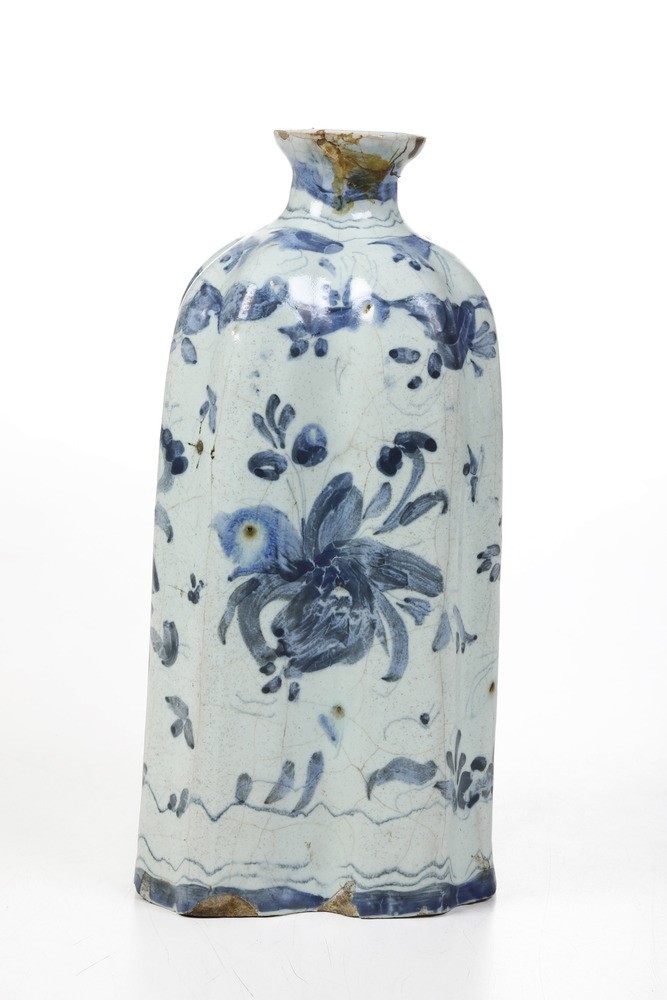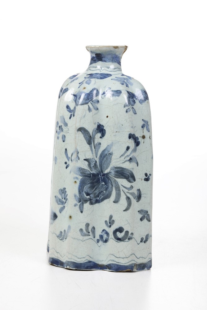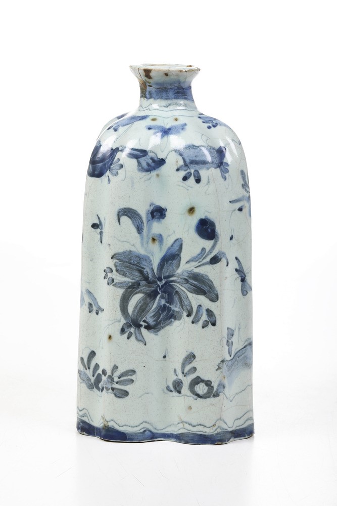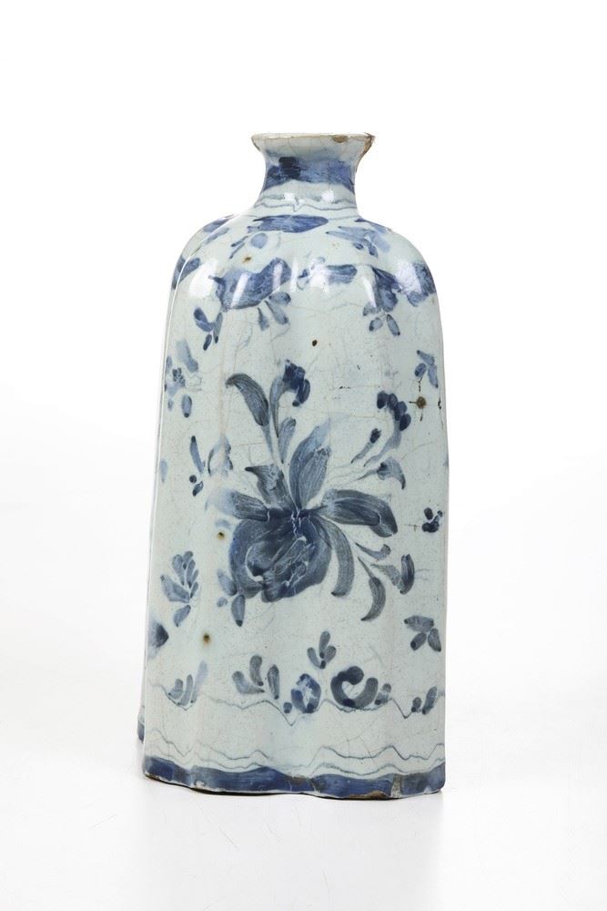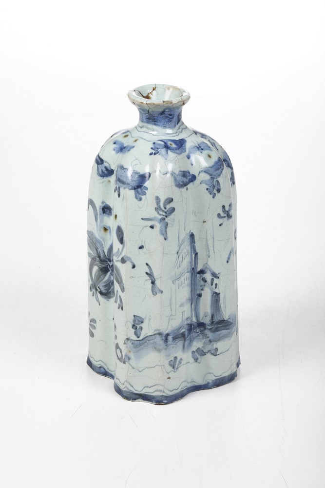 La bottiglia, dal corpo a sezione quadrangolare costolato rivestito di smalto stannifero leggermente azzurrato, è decorata in monocromia blu di cobalto col motivo savonese “a tapezzeria” con un edificio turrito e elementi vegetali