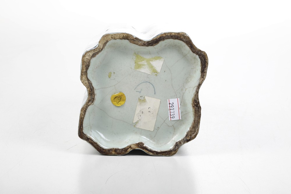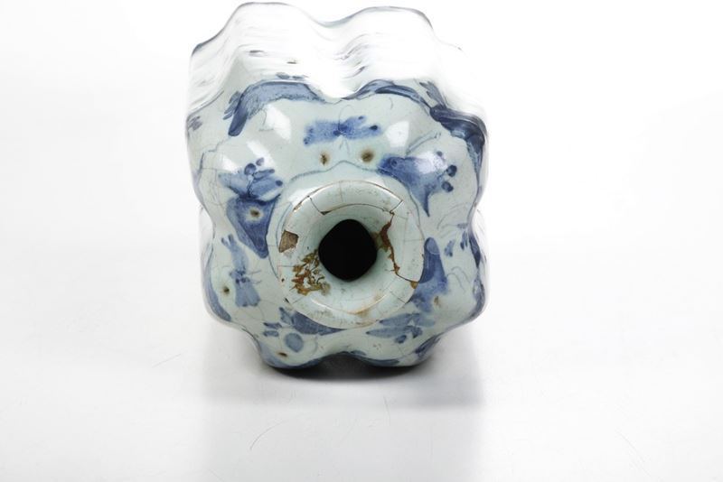 Maiolica. Marca: “G” in blu. Altezza cm 25. Conservazione: ottima; rottura incollata al bordo superiore; qualche caduta di smalto ai bordi