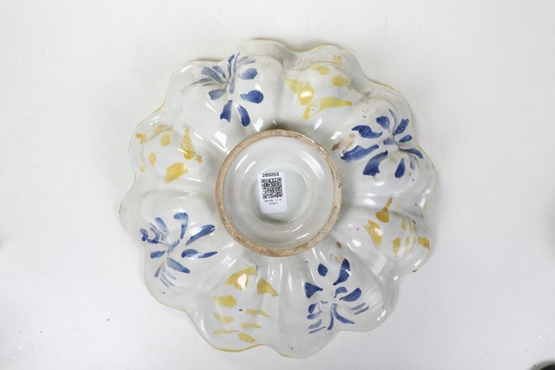 Sul verso sono dipinti, in alternanza, ciuffi vegetali in azzurro e giallo. Brillante e spessa smaltatura integrale, che tecnicamente discende dai “bianchi”, e decorazione in policromia