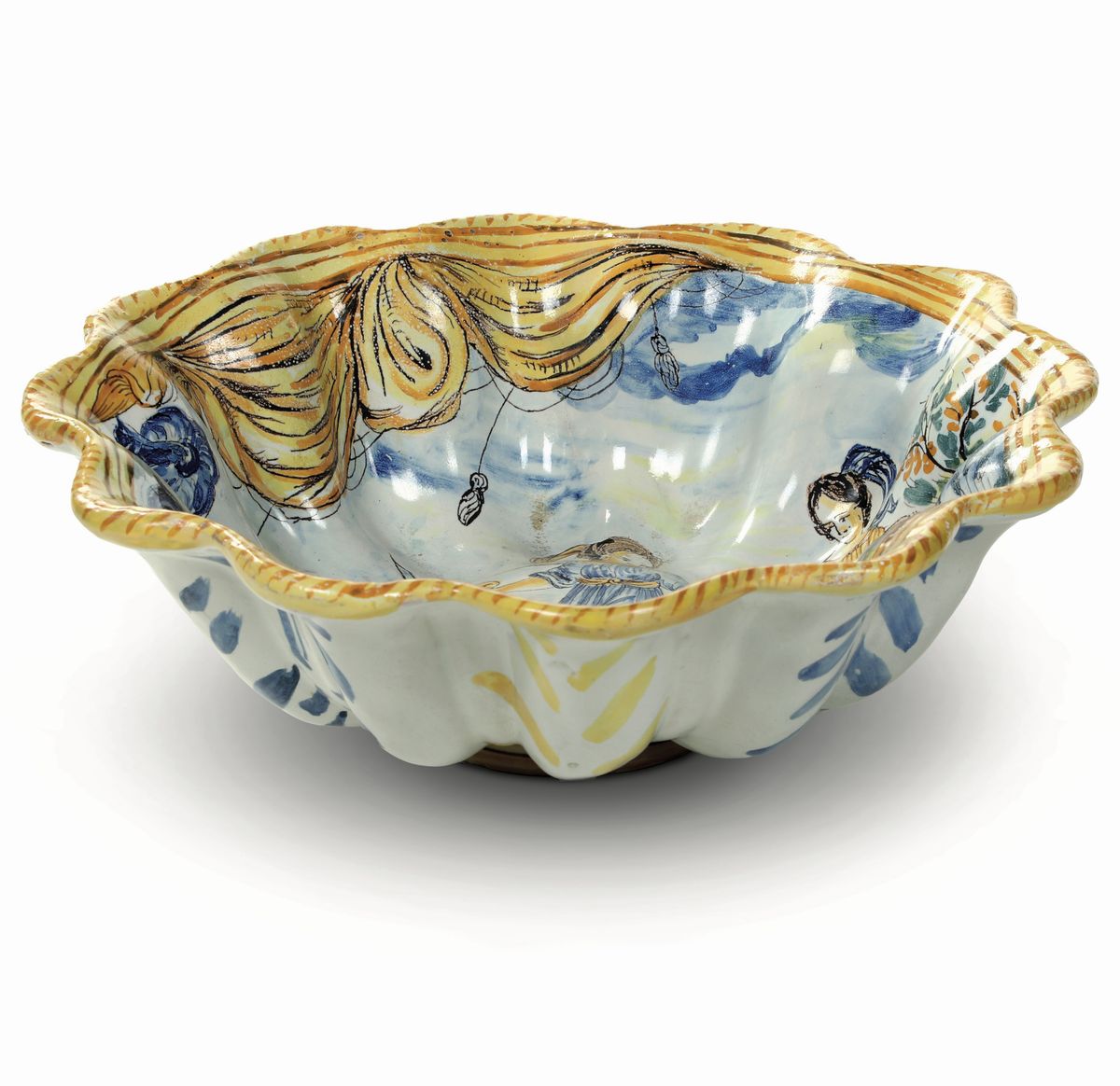 Grande coppa a profilo svasato, parete baccellata ad orlo ondulato e basso piede. Al centro è istoriato l’episodio biblico di Giuditta, nel momento in cui la giovane vedova ebrea porge ad una fantesca la testa del generale assiro Oloferne, che assediava la città di Betulia.