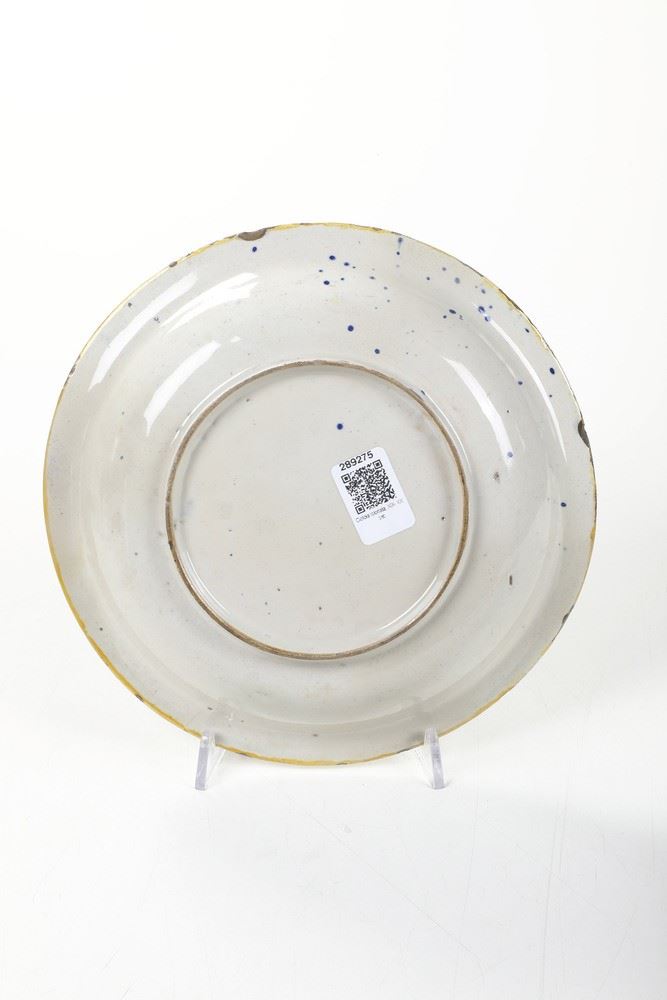Maiolica. Dimensioni: altezza cm 4,5; diametro cm 25. Conservazione: rotto in due frammenti e ricomposto in restauro; piccole sbeccature alcune restaurate al bordo