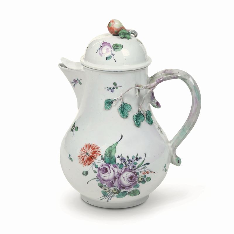 Porcellana. Marca: assente. Altezza cm 20,2. Conservazione: restauro al labbro superiore del beccuccio, ai sottili ramoscelli del manico e della presa del coperchio
