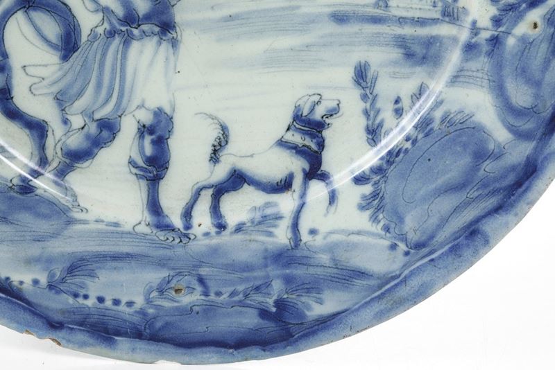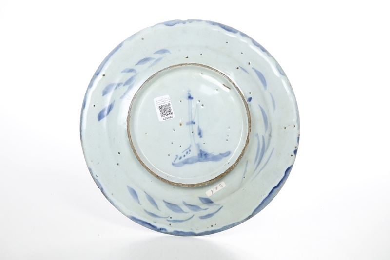 Maiolica decorata in monocromia blu di cobalto su smalto azzurrino. Marca: lanterna in blu. Diametro cm 35.
