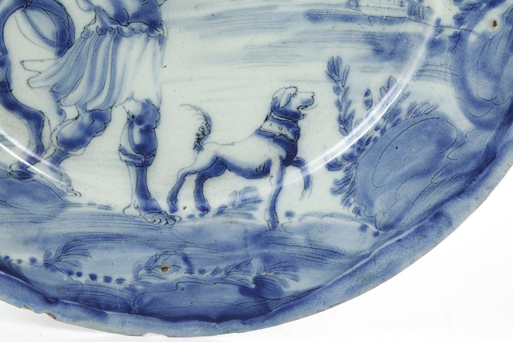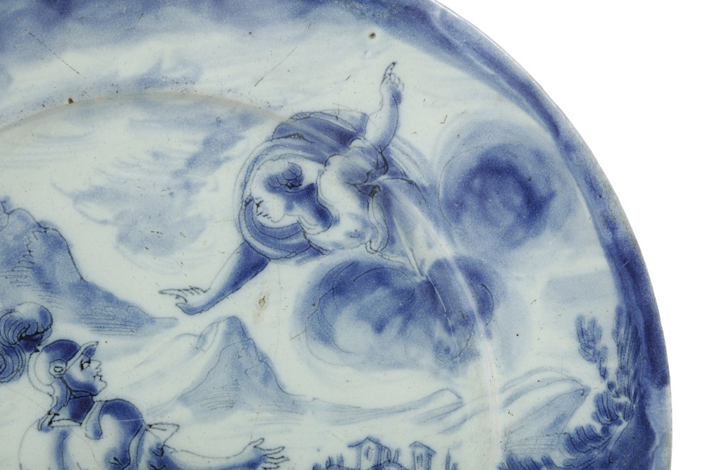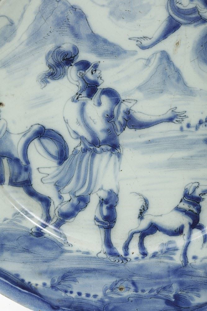 Il piatto è decorato sull’intera superficie a scenografia barocca con un ampio paesaggio che ospita, in primo piano, un soldato romano con il suo cavallo e un cane nell’atto di rivolgersi ad una dea in cielo tra le nuvole. Sul verso rapide pennellate di foglie che incorniciano la grande marca