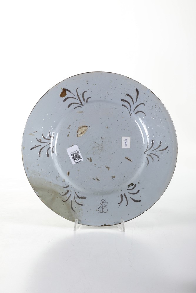 Maiolica. Marca: “AF” con ancora a tre marre. Diametro cm 35,2. Conservazione: rottura sulla tesa alle ore 9 ricomposta in vecchio restauro