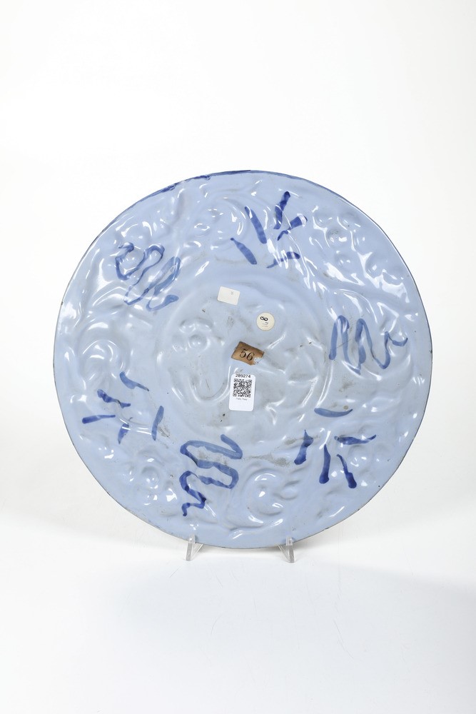 Maiolica monocroma blu a gran fuoco. Marca: assente. Diametro cm 39,8. Conservazione: rotto in due frammenti tra le ore 7 e le ore 11; qualche minima ripresa allo smalto