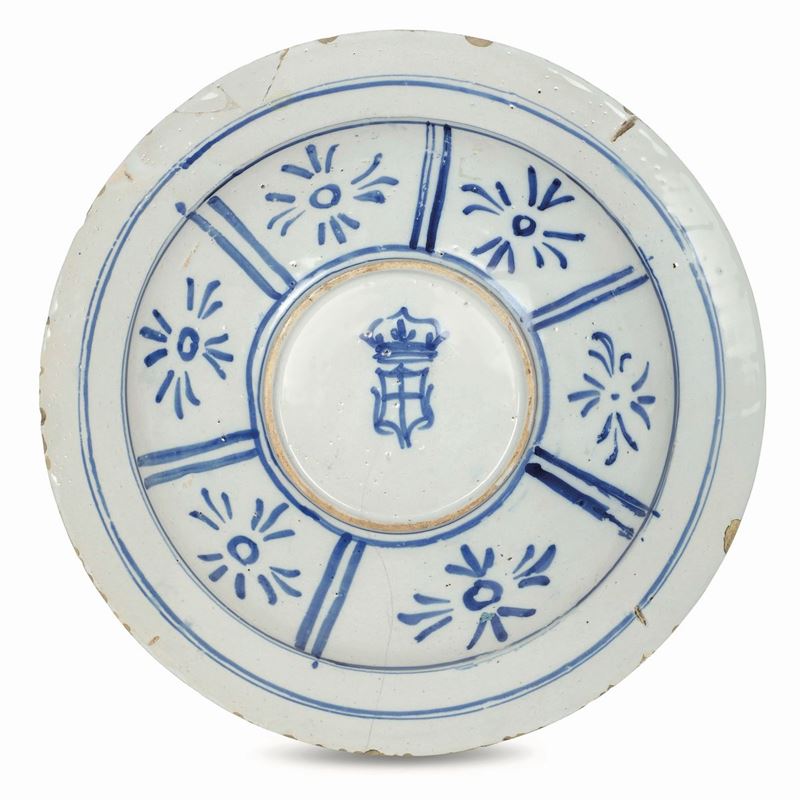 Maiolica decorata in monocromia blu di cobalto a gran fuoco. Marca: scudo crociato con corona. Diametro cm 34,5. Conservazione: piccola sbeccatura incollata al bordo alle ore 4; due insignificanti felature; piccole sbeccature al bordo.