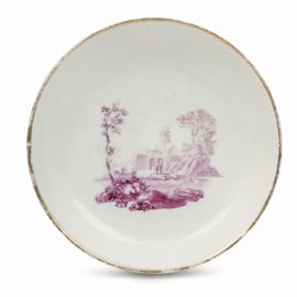 Piattino decorato in monocromia rosso porpora con un paesaggio di riva con barcaiolo e viandanti tra vegetazione e un castello sullo sfondo. Bordo listato in oro