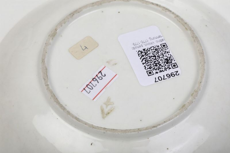 Porcellana. Marca: lettera “V” sormontata da “+” incisi. Diametro cm 16,5. Conservazione: leggere usure allo smalto e all’oro