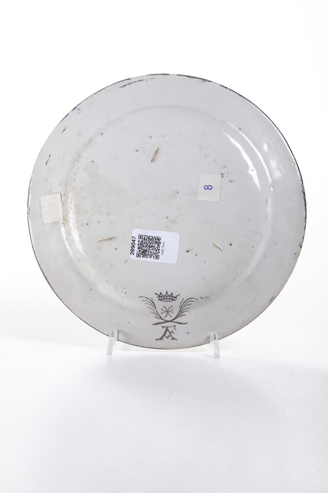 Maiolica a gran fuoco. Marca: “AF” sormontato da Croce di Malta e corona tra due rami di palma incrociati. Diametro cm 23. Conservazione: ottima; insignificanti salti di smalto al bordo