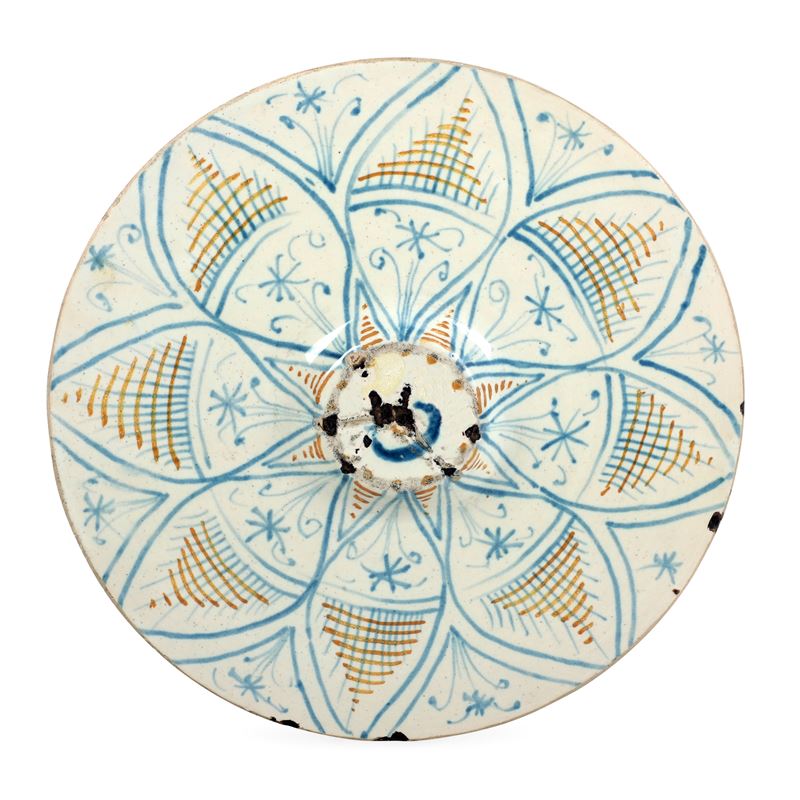 Piatto piano, con accenno di piede. Sul recto si dispone una simmetrica composizione che dal centro, in cui è dipinta una rosetta, contornata da foglie acuminate e bipartite, comprende otto moduli vegetali stilizzati, dipinti in monocromia blu su fondo giallo, con bulbi, foglie lanceolate e dentellate, palmette fiorite ecc. Sul verso, al centro del piede, è tracciata in azzurro la marca “C”, e sulla restante superficie sono disposti otto larghi petali cuspidati campiti con tratteggio (“petal-back”)