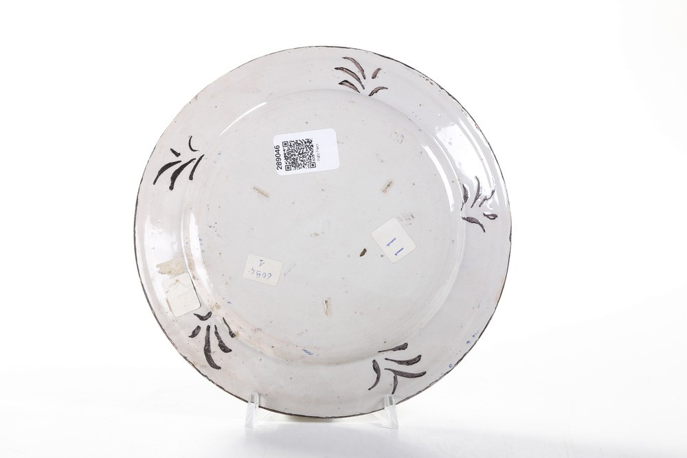 Maiolica decorata in policromia a gran fuoco. Marca: assente. Diametro cm 23. Conservazione: ottima; insignificanti cadute di smalto al bordo.