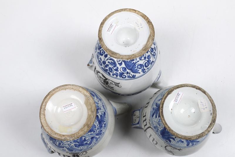 Maiolica decorata in monocromia blu e manganese. Marca: assente. Altezza massima cm 22,2 circa. Conservazione: bottiglia restaurata; vaso con integrazioni al bordo superiore e sbeccatura al bordo della base; due orcioli con piccoli restauri ai bordi e uno all’ansa; restauri minori