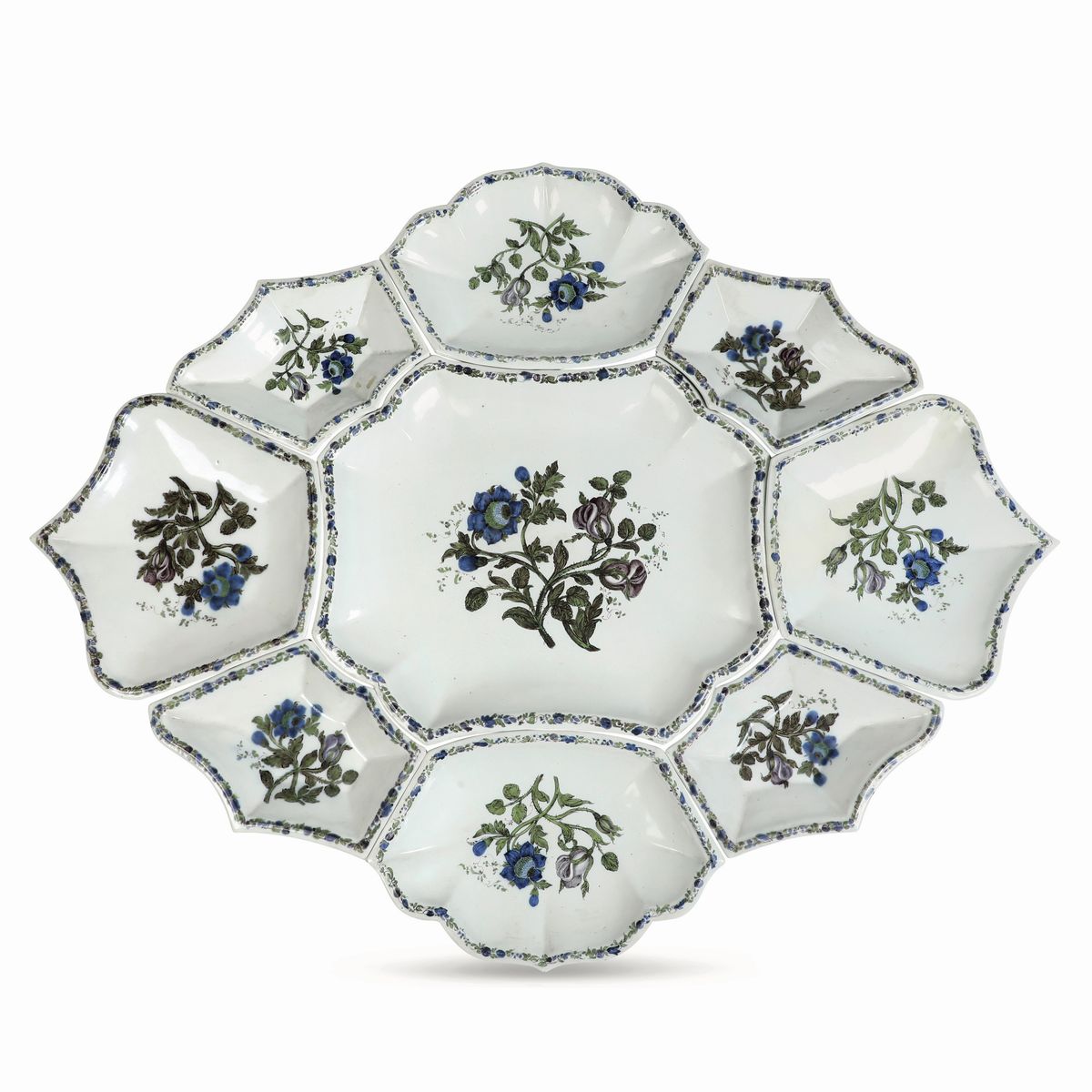 Il centrotavola è composto da otto piccoli contenitori disposti attorno ad un vassoio centrale, a formare come un grande fiore. E’ decorato in policromia a gran fuoco con un accurato ed elegante motivo a sinuosi steli recisi che portano anemoni e rose. Non conosciamo esattamente la funzione di questo centrotavola