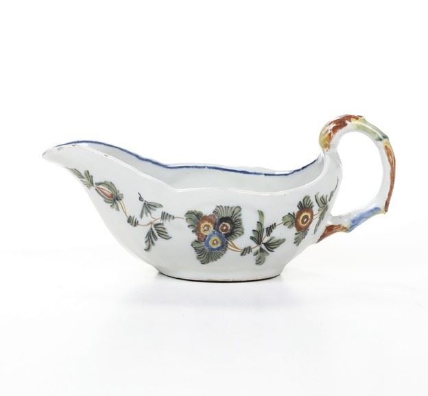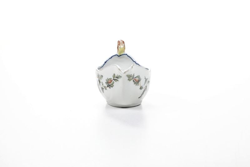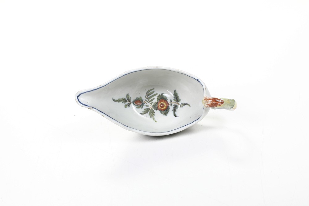 Salsiera dal manico modellato a ramo di bambù, decorata con il motivo comunemente conosciuto come “a tacchiolo” ma definito “blanser” negli inventari della manifattura