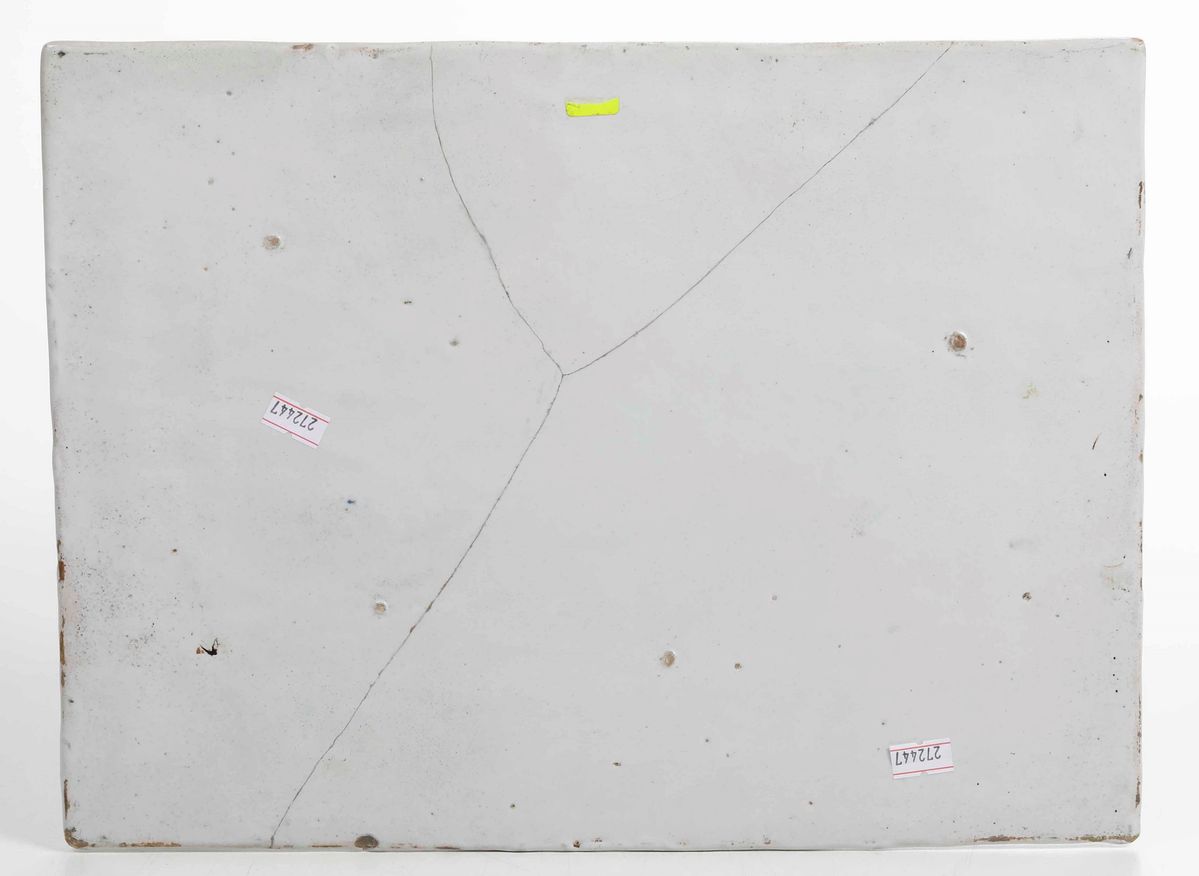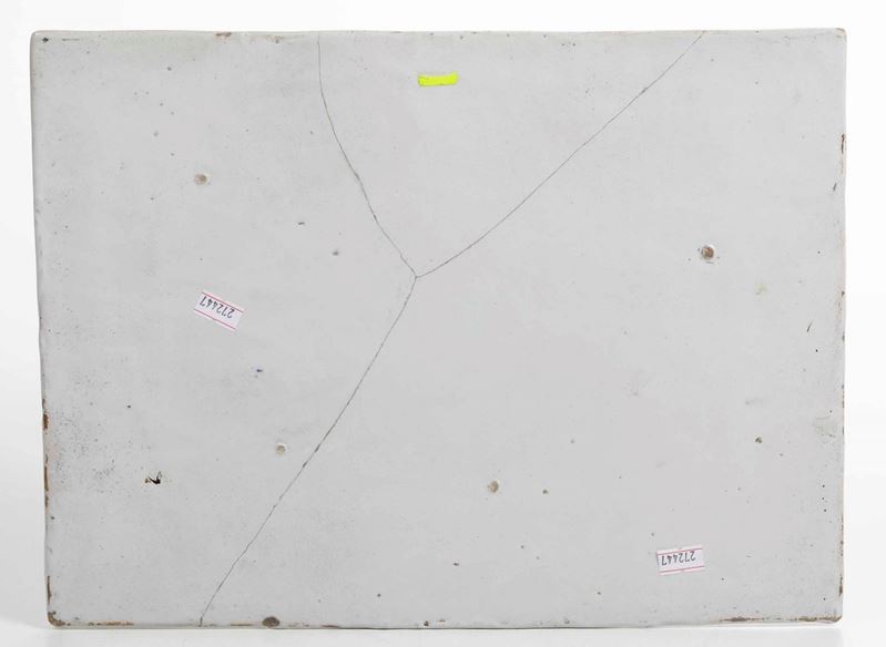 Maiolica dipinta con colori a gran fuoco. Dimensioni: cm 28x37,5. Conservazione: rotta in tre frammenti (visibili sul verso) ricomposti in restauro; minime sbeccature restaurate al bordo