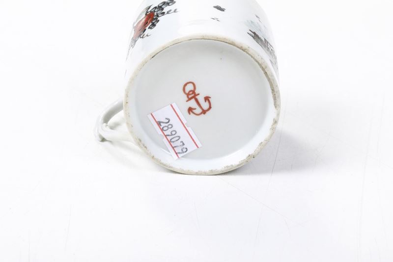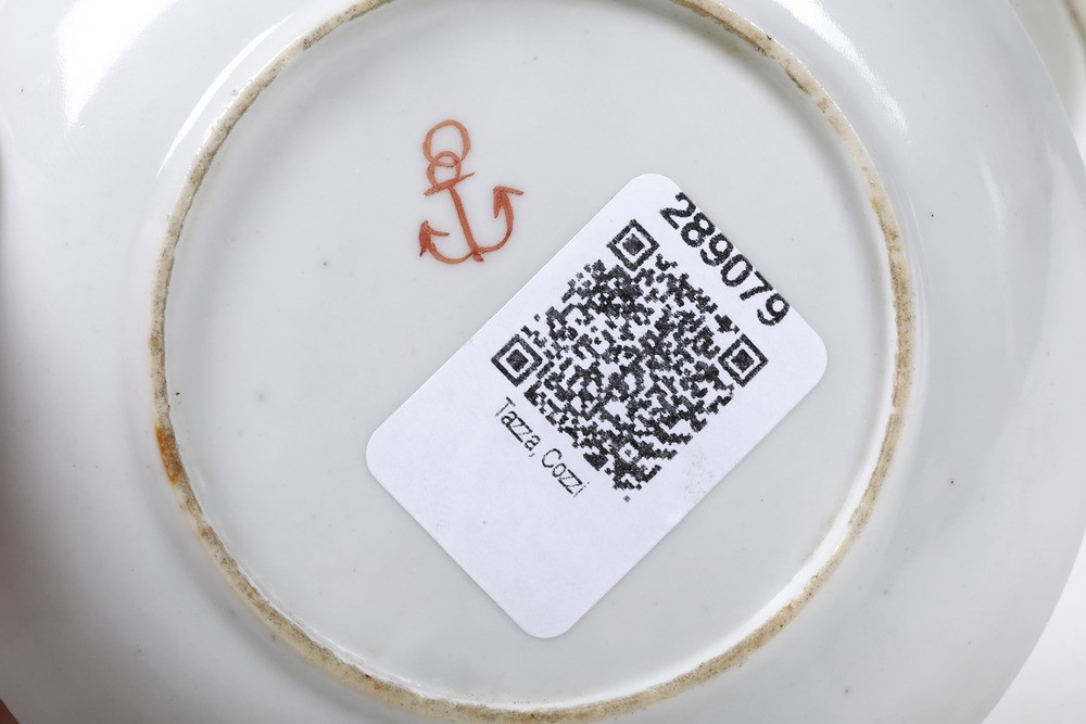 Porcellana. Marca: ancora in rosso. Dimensioni: altezza tazza cm 5,6; diametro piattino cm 11,8. Conservazione: manico riattaccato in restauro