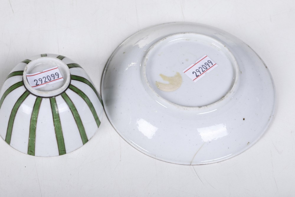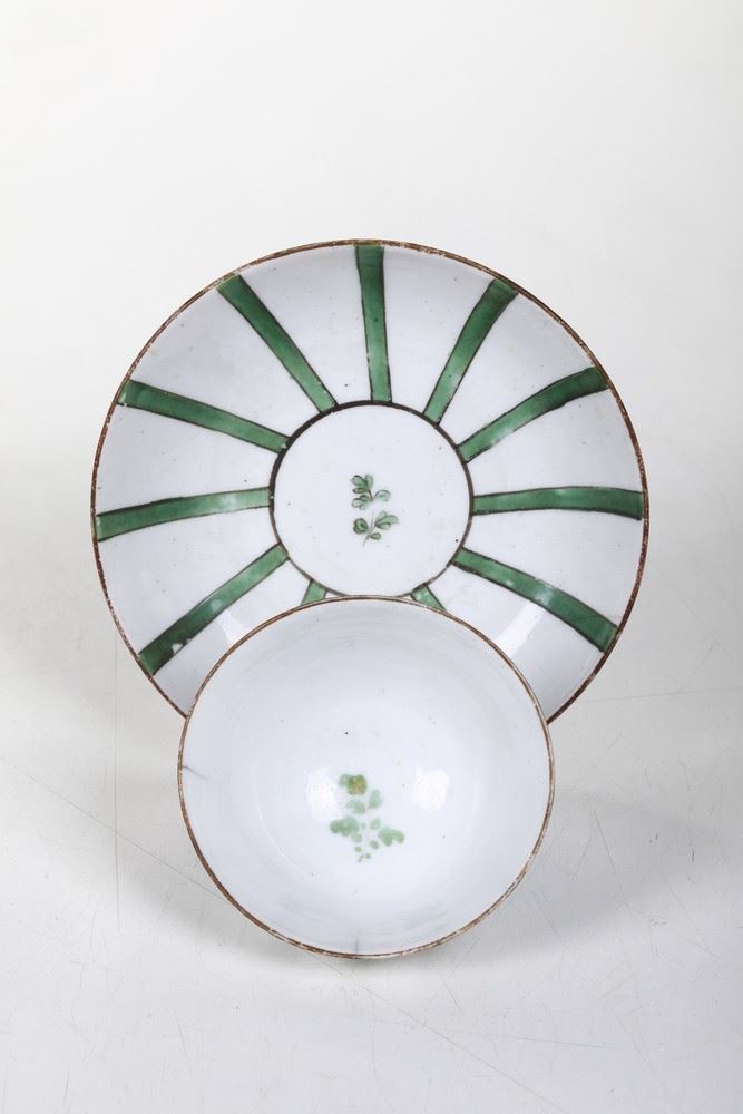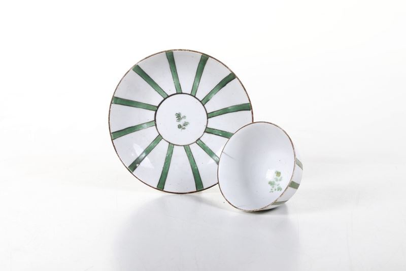 Porcellana. Marca: assente. Dimensioni: altezza tazza cm 3,8; diametro piattino cm 11,6. Conservazione: insignificanti usure allo smalto; due insignificanti felature al bordo della tazza e una al bordo del piattino
