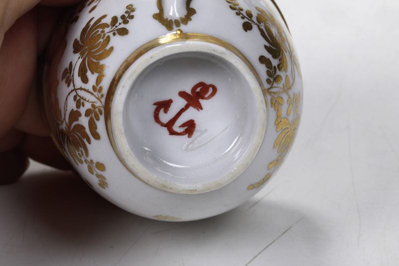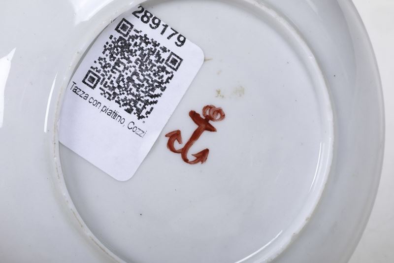 Porcellana. Marca: ancora in rosso. Dimensioni: altezza tazza cm 6,9; diametro piattino cm 12,4. Conservazione: ottima