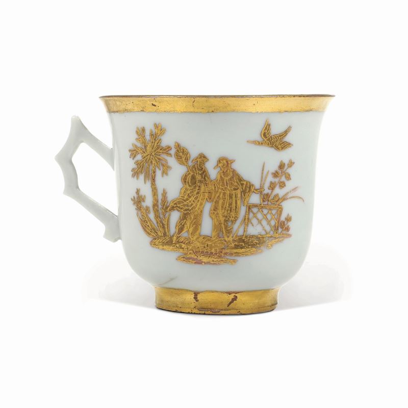 Questa rara tazza dal sottile manico piatto e mistilineo, è decorata in oro graffiato con due scene a cineserie. Su zolla a isola due cinesi stanno tra vegetazione, inoltre un uccello in volo. Ai bordi larga fascia e interno della tazza in oro.