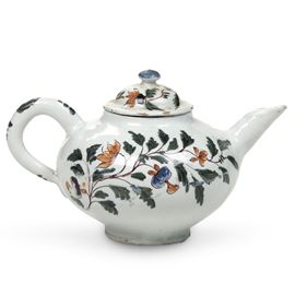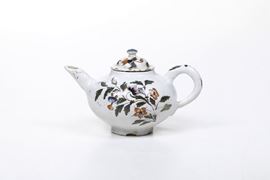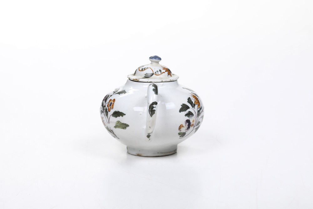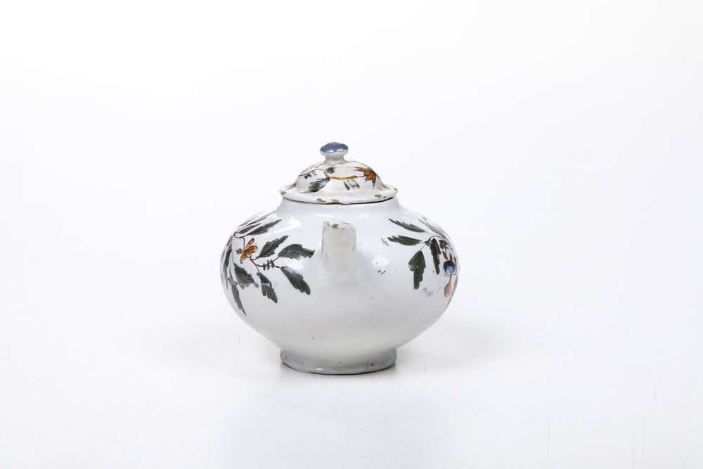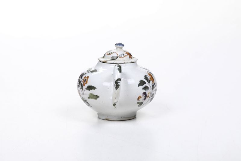 Il modello di questa teiera è tratto da quelle in porcellana coeve cinesi e già in uso nella fabbrica veneziana Vezzi. Dalla forma globulare presenta il manico ad ansa e il cannello a tubicino. Due lunghi rami con steli fioriti e fogliati, dipinti in policromia, occupano quasi tutta la superficie