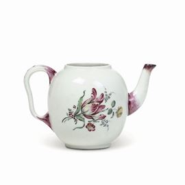 Il modello di questa teiera, dal caratteristico manico, si ispira ad una forma già in uso presso gli Hannong nella manifattura di Frankenthal e ripresa dalle teiere francesi di Vincennes. La decorazione vede sui due lati bouquets di fiori recisi nei quali campeggia una rosa e rispettivamente un tulipano sapientemente dipinti in policromia. Profilature in porpora ornano il beccuccio e il manico