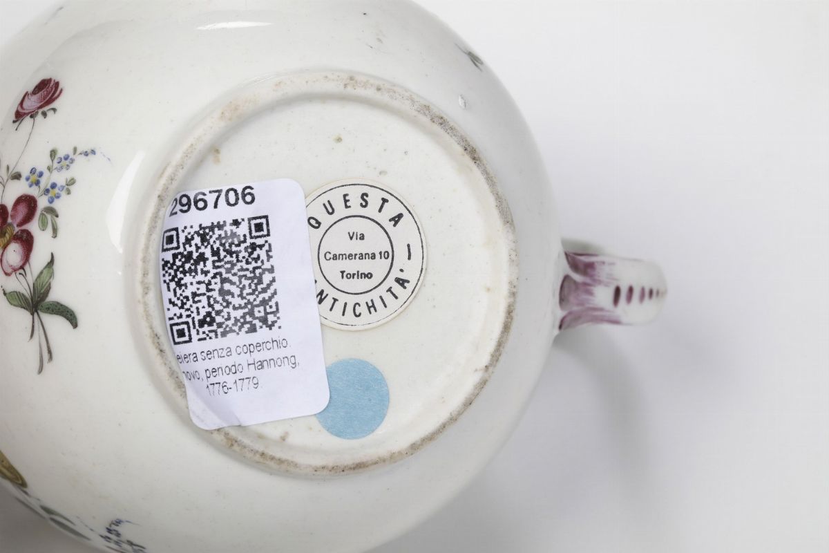 Porcellana. Marca: lettera “V” sormontata da “+” incisi. Altezza cm 11,2. Conservazione: buona; restauro al bordo superiore del beccuccio; coperchio mancante. Provenienza: "Antichità Questa, Torino” come risulta da etichetta cartacea posta sotto la base