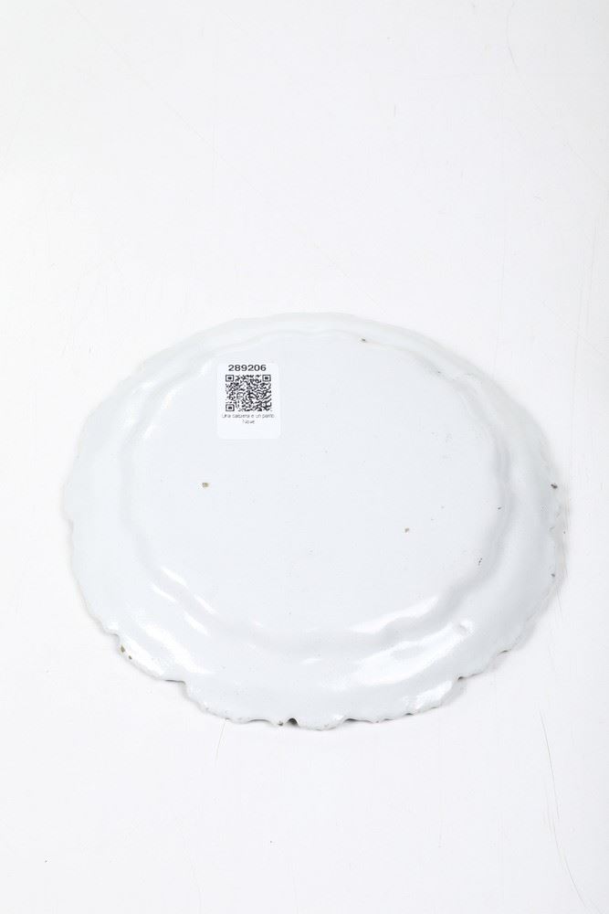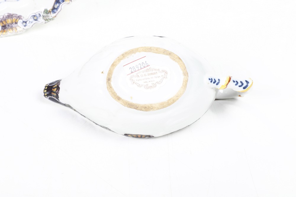 Maiolica policroma a gran fuoco. Marca: assente. Dimensioni: salsiera altezza cm 8,8; 19x9,2; piatto diametro cm 20,2. Conservazione: ottima; insignificanti usure di smalto ai bordi