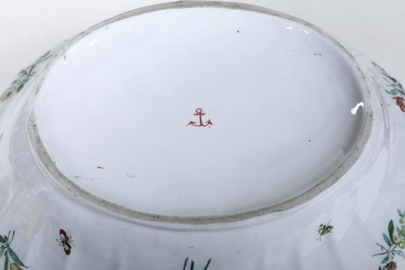 Porcellana. Marca: ancora in rosso sotto la zuppiera. Dimensioni: altezza totale cm 24; 31,5x23. Conservazione: presa del coperchio con parte di una foglia superiore incollata; sbeccature e restauri minori