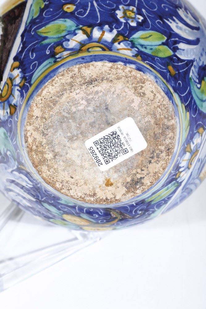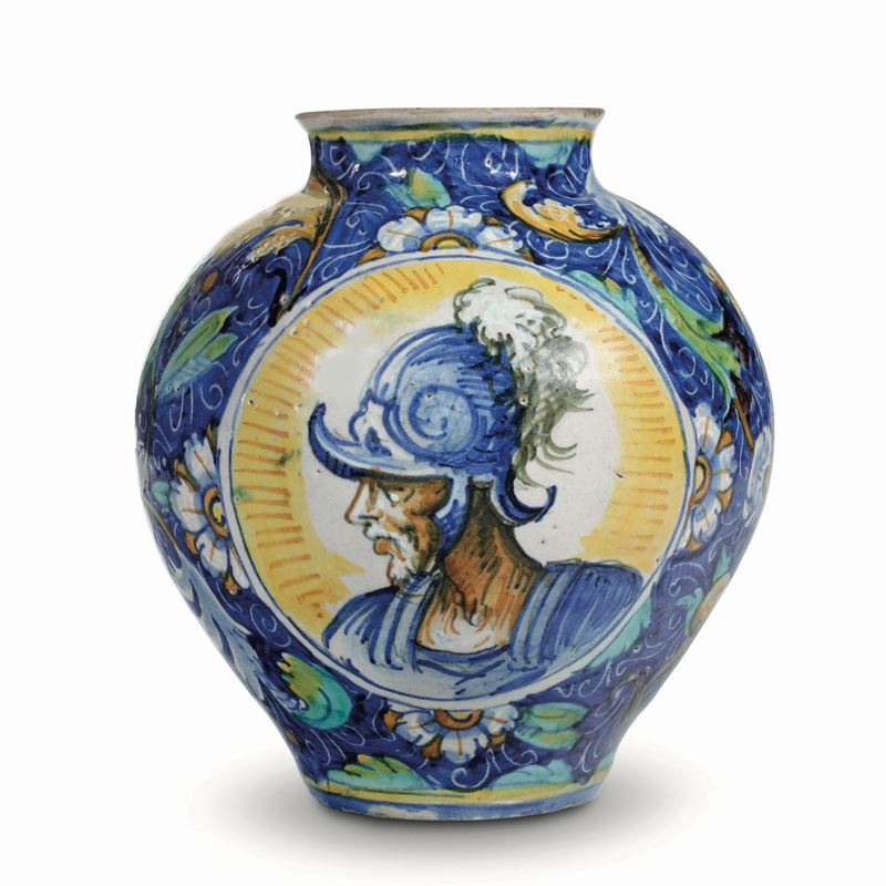 Anche in assenza del cartiglio, si può ipotizzare che l’opera fosse di destinazione farmaceutica, genere in cui si era specializzata la feconda bottega di mastro Domenego a Venezia nel corso della seconda metà del ‘500. Come molte di queste “bocce” uscite dalla nota bottega veneziana, coniuga le flessuose cadenze dei fogliami e frutti come sfondo complementare a due grandi medaglioni a fondo giallo molto luminoso, entro cui campeggiano in tutta la loro monumentale ampiezza due busti, decisamente influenzato, nell’iconografia e nel ductus, tutto fluidità e scioltezza, dell’osservazione dell’ambiente pittorico lagunare. Per confronti con vasellami della stessa tipologia, nel Museo di Faenza, v.: RAVANELLI GUIDOTTI C., Omaggio a Venezia, maioliche veneziane tra Manierismo e Barocco nelle raccolte del Museo Internazionale delle Ceramiche in Faenza, II, Faenza 1998, pp. 69-92