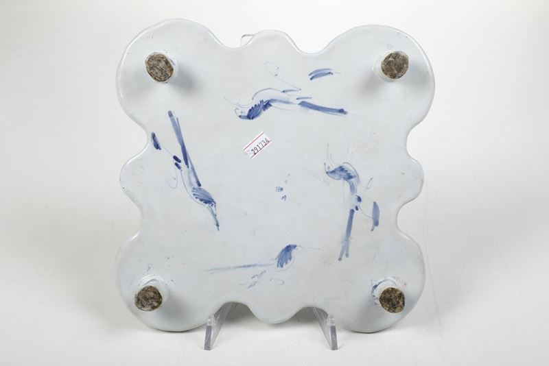 Maiolica. Marca: stemma di Savona e lettere “BA”. Dimensioni: altezza cm 3,6 circa; cm 25,3x25,3. Conservazione: restauri al bordo e ai piedini