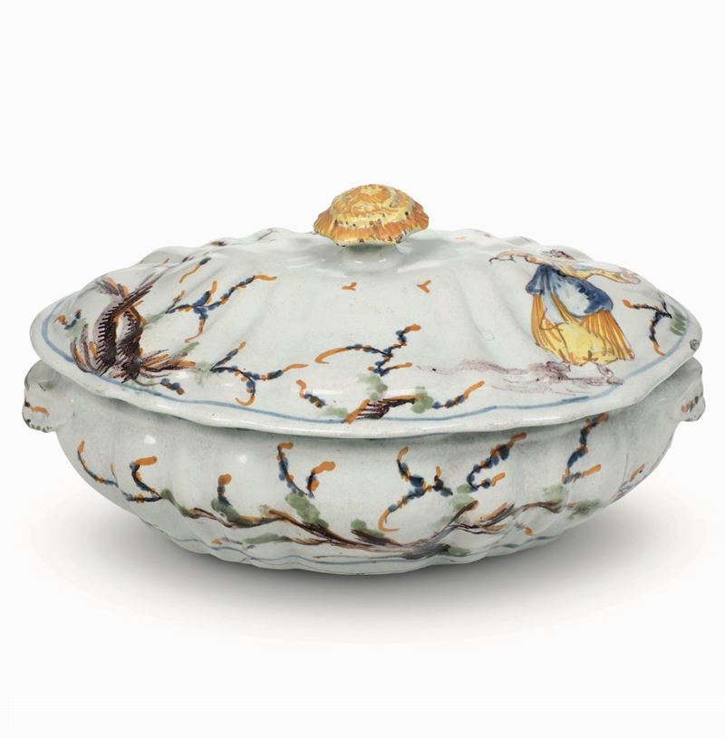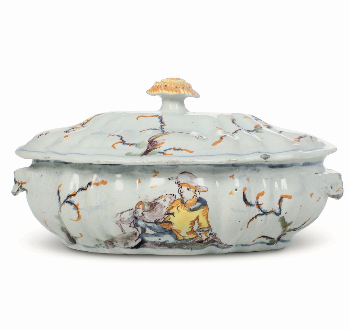 Zuppiera polilobata decorata in policromia con il motivo a grandi “figuretti”: una contadina, occupa il coperchio, un pastore occupa il fronte della zuppiera tra tronchi d’albero fioriti. In lontananza piccoli uccelli in volo. Presa modellata a fiore