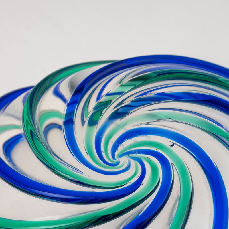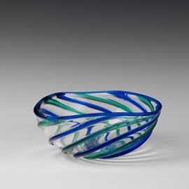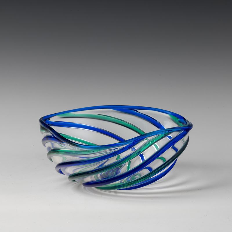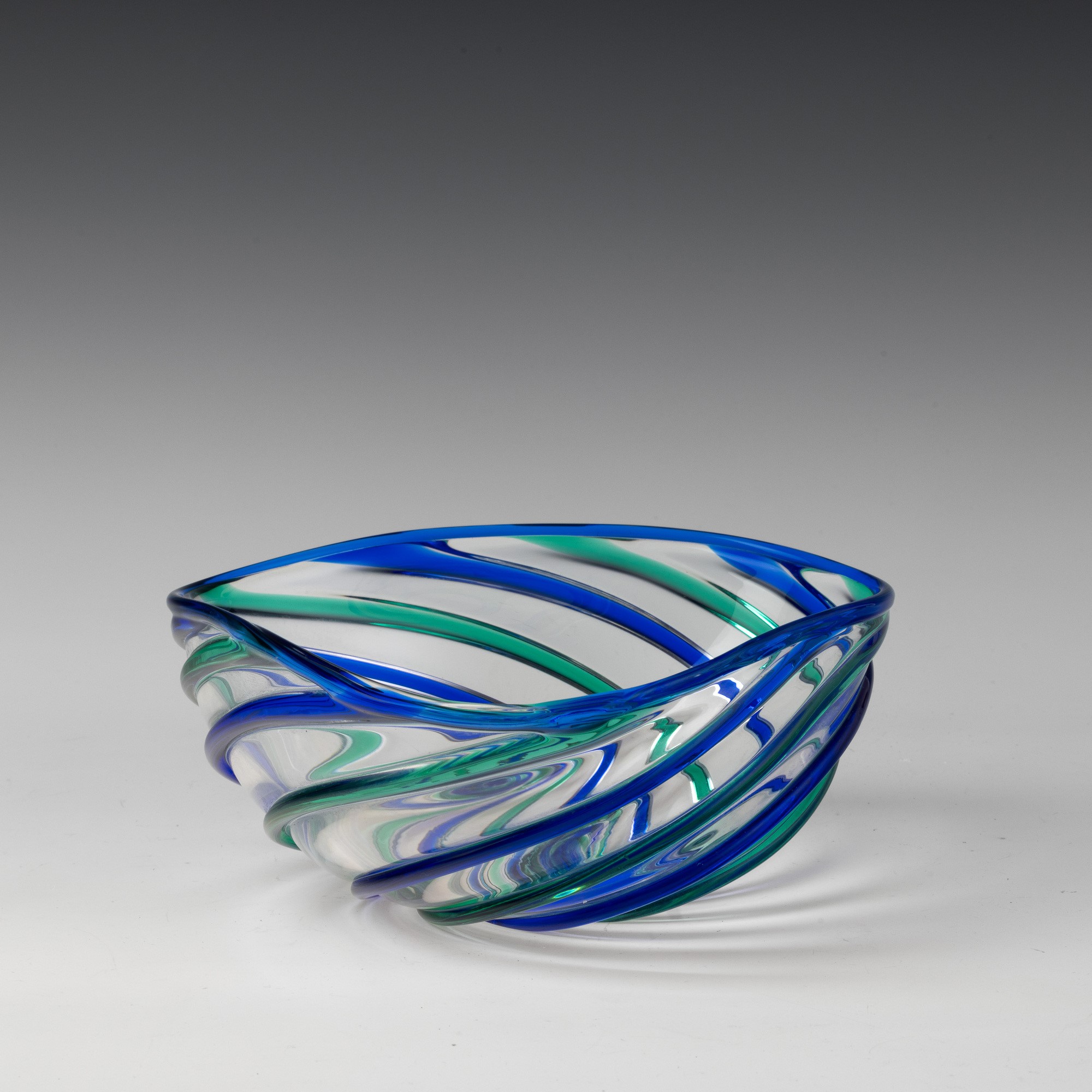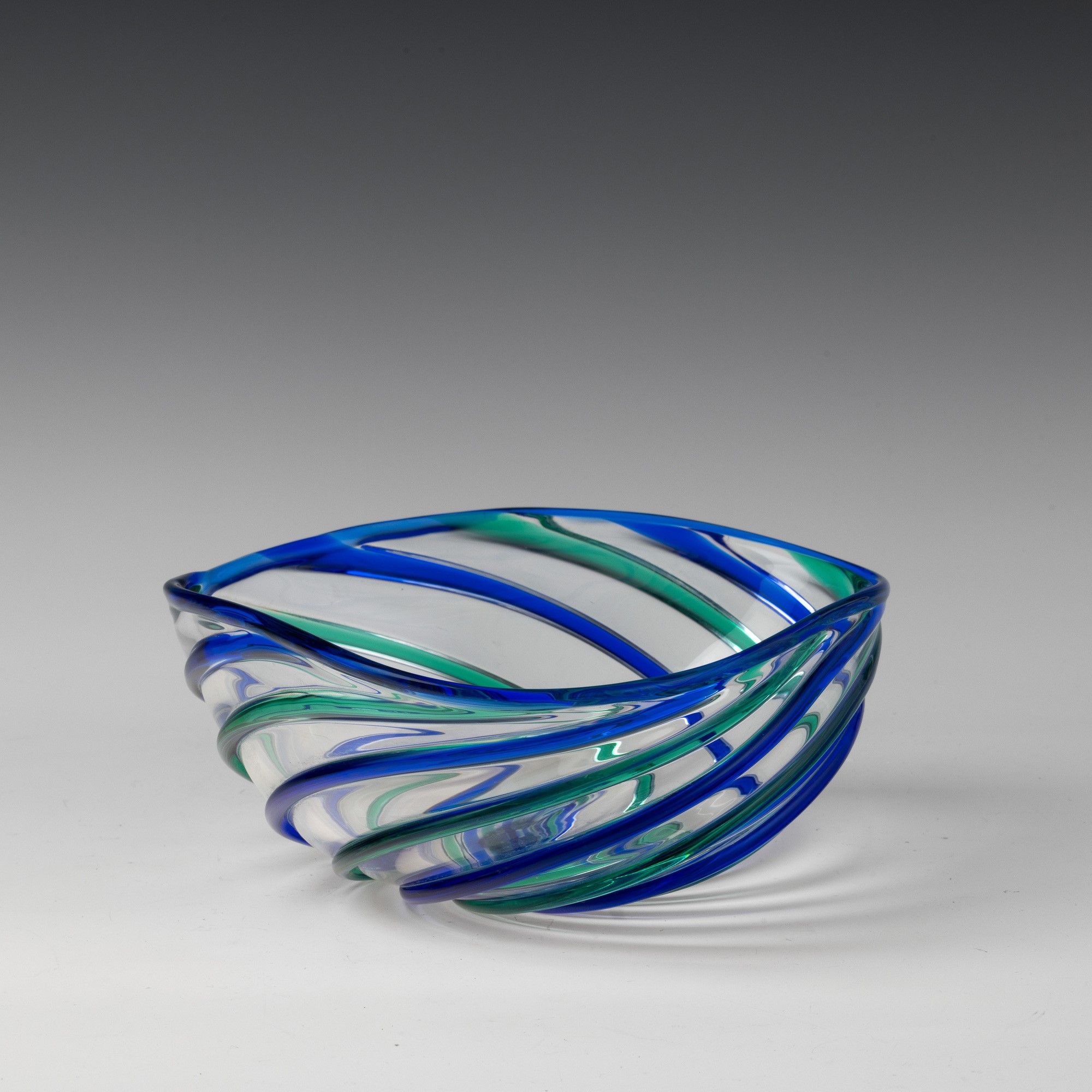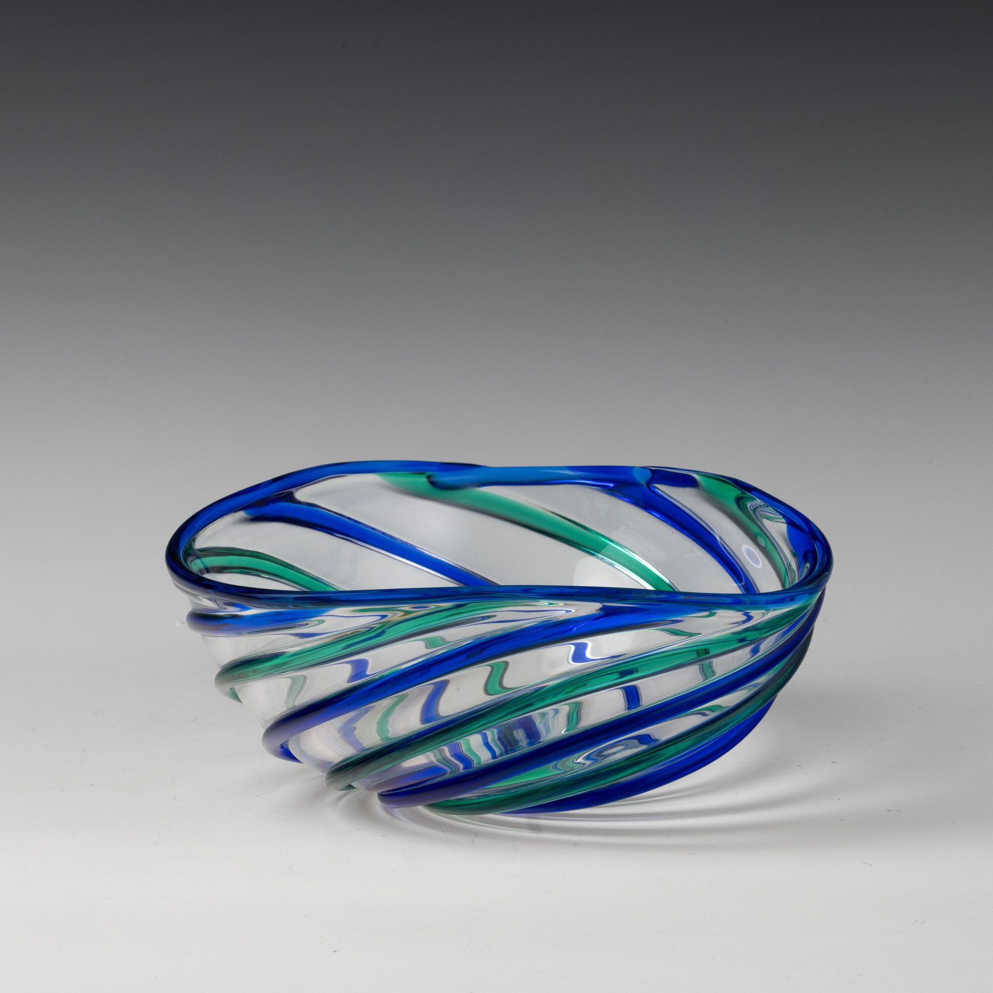 Coppa triangolare in vetro soffiato con decoro di canne spiralate blu e verdi.