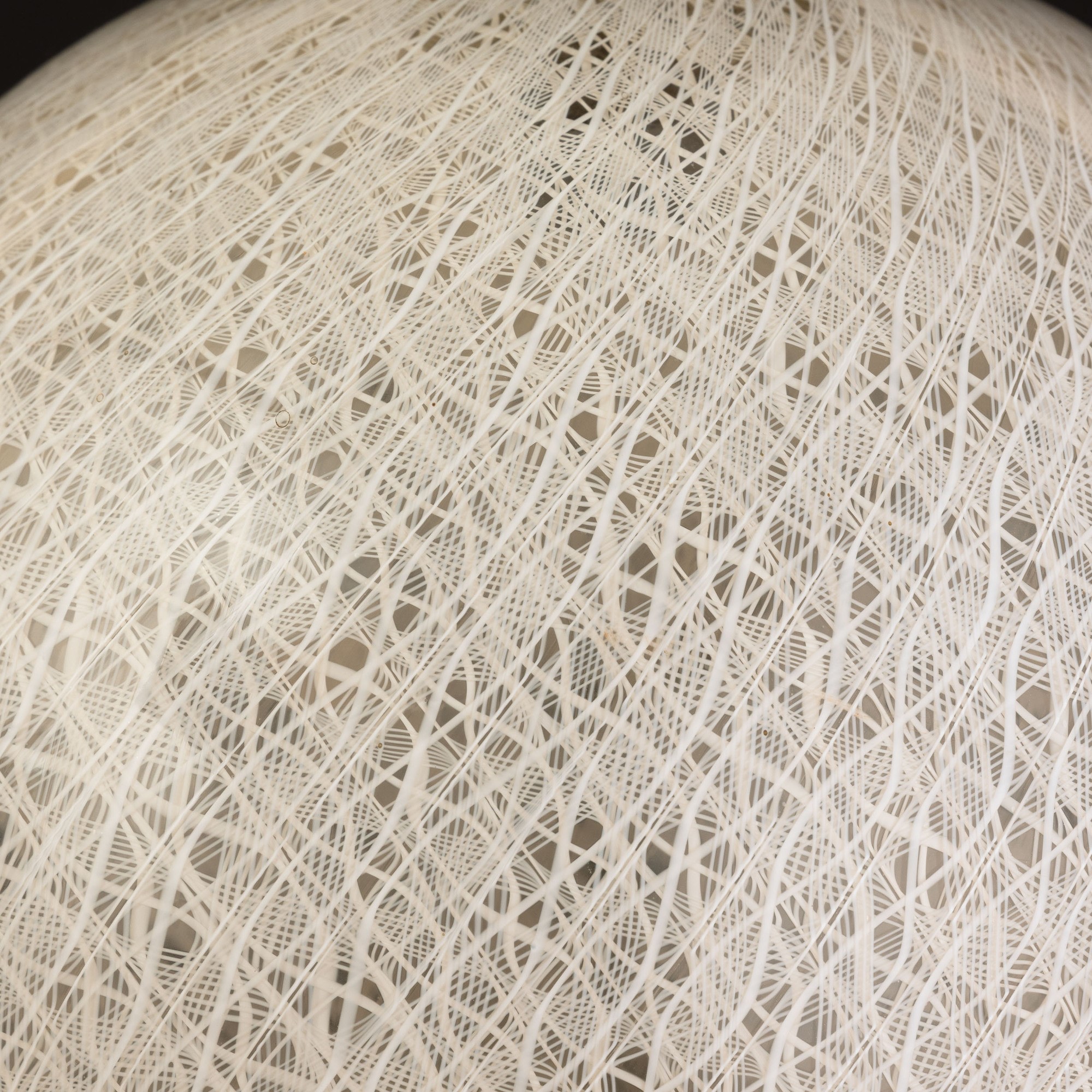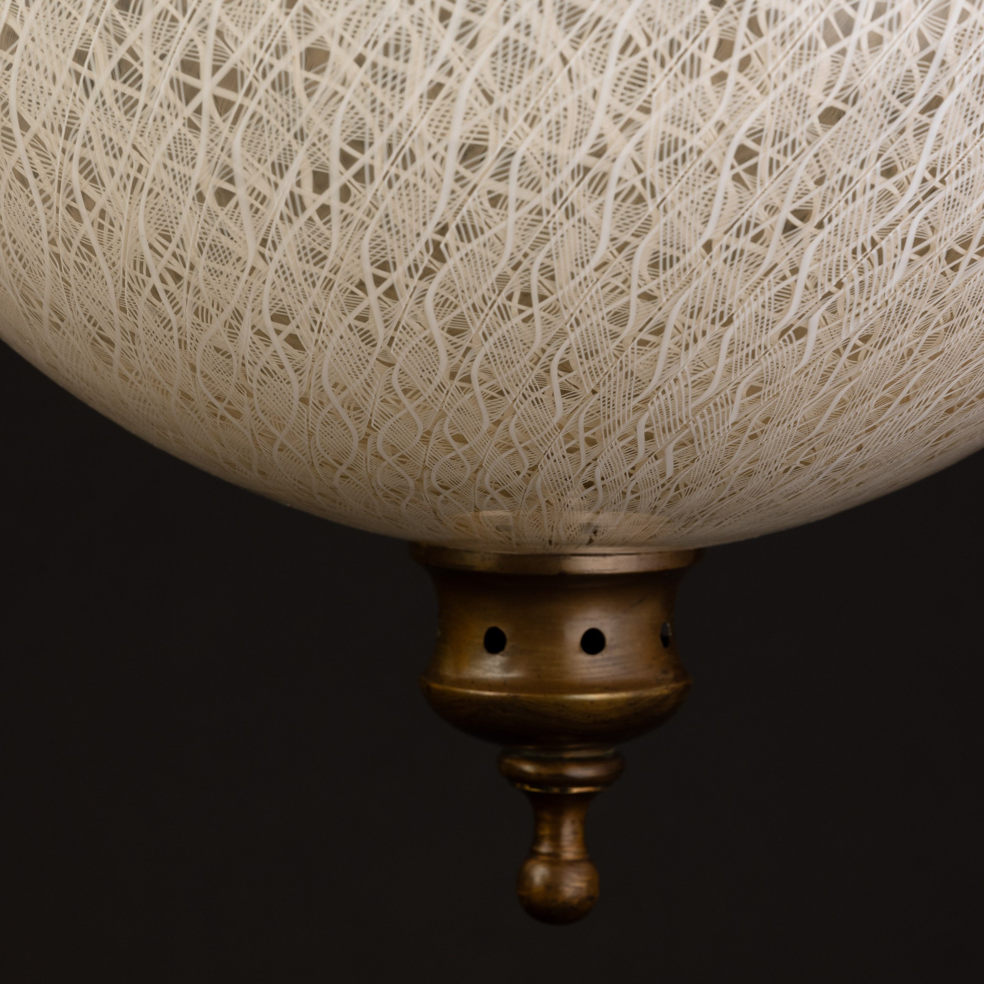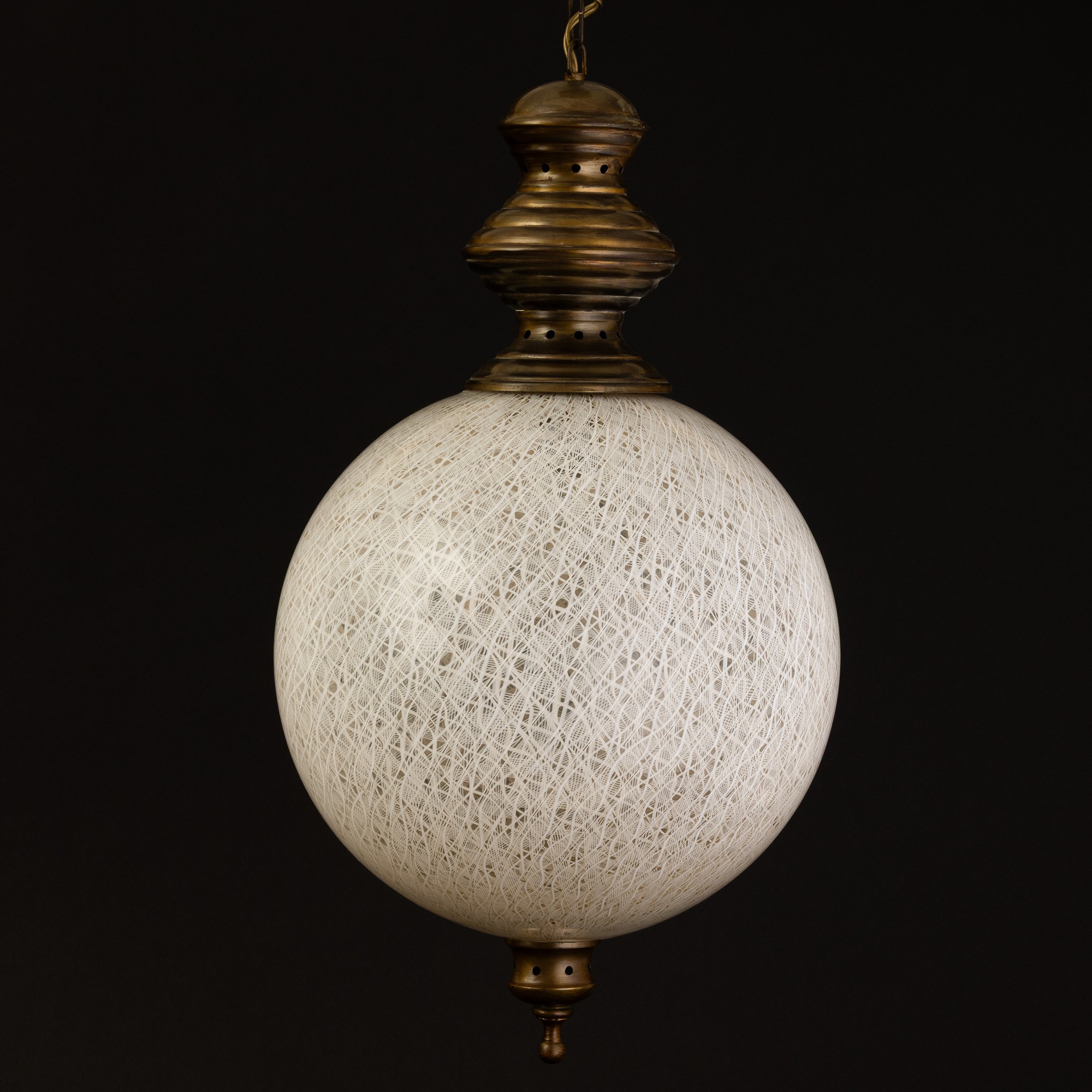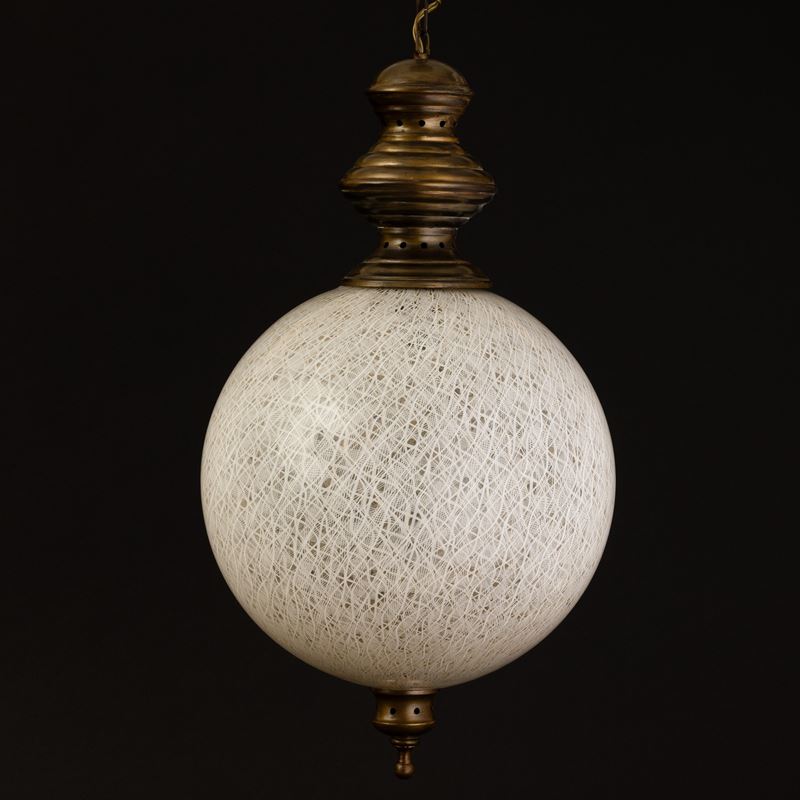 Lampada a sfera in vetro soffiato con decoro di canne zanfirico. Struttura in ottone.