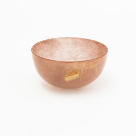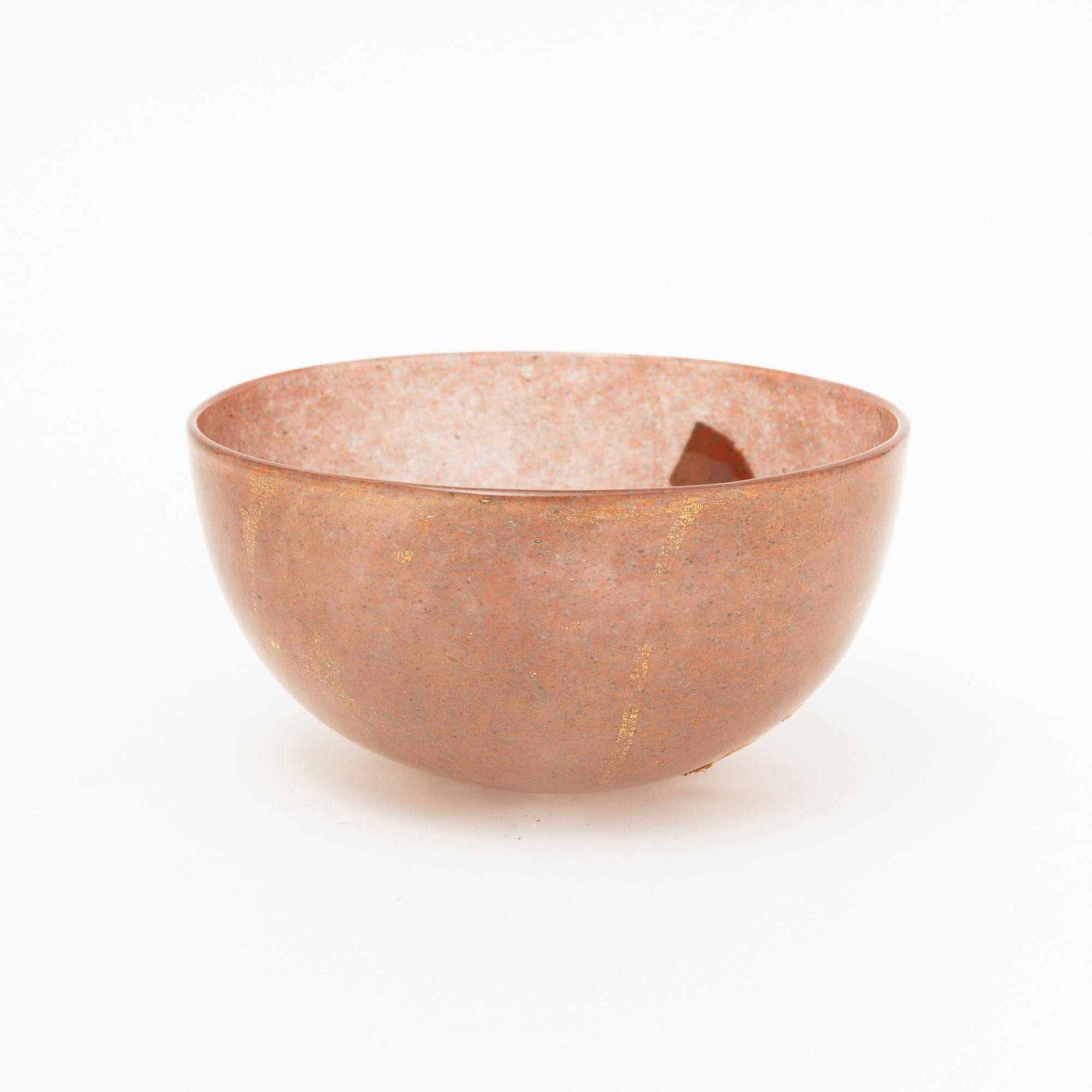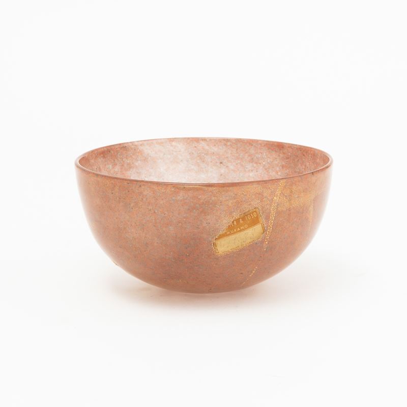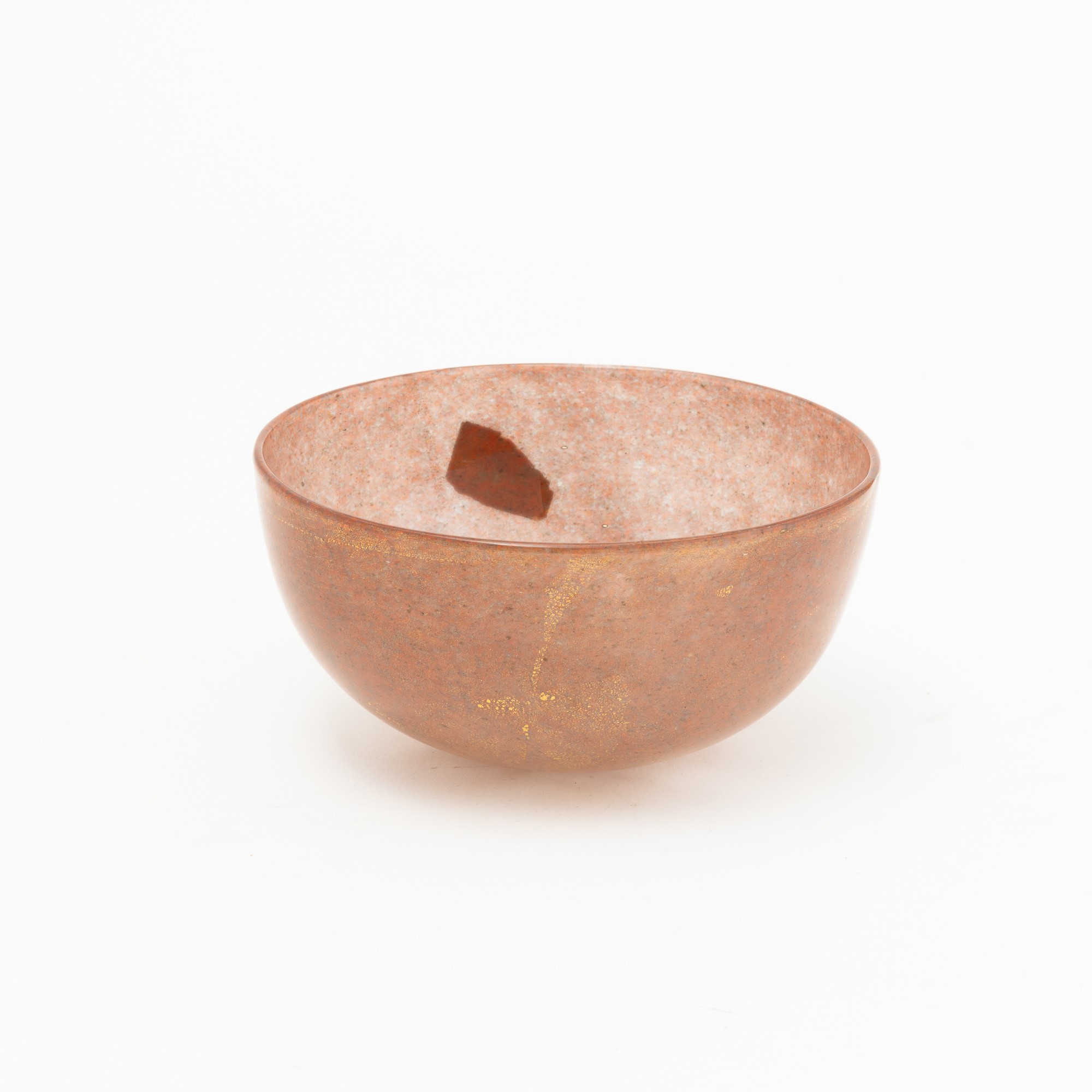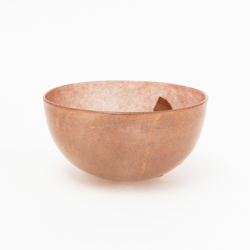 Coppa semisferica in vetro soffiato con decoro di polveri policrome e foglia oro.
