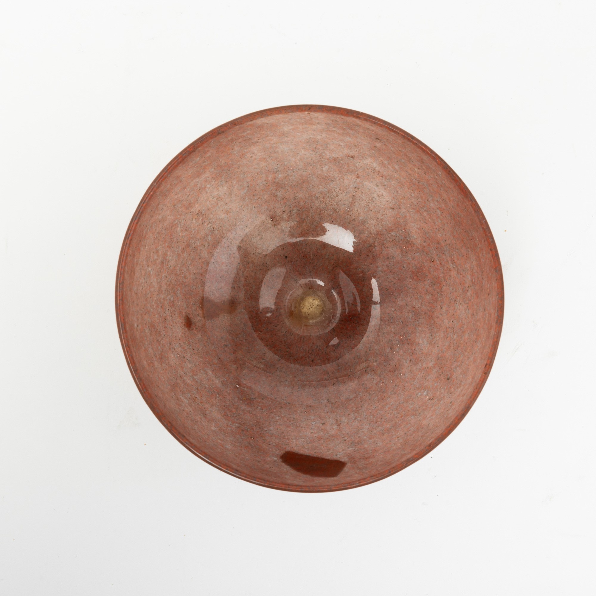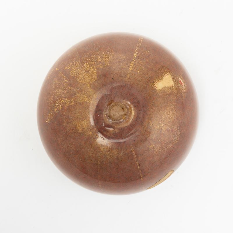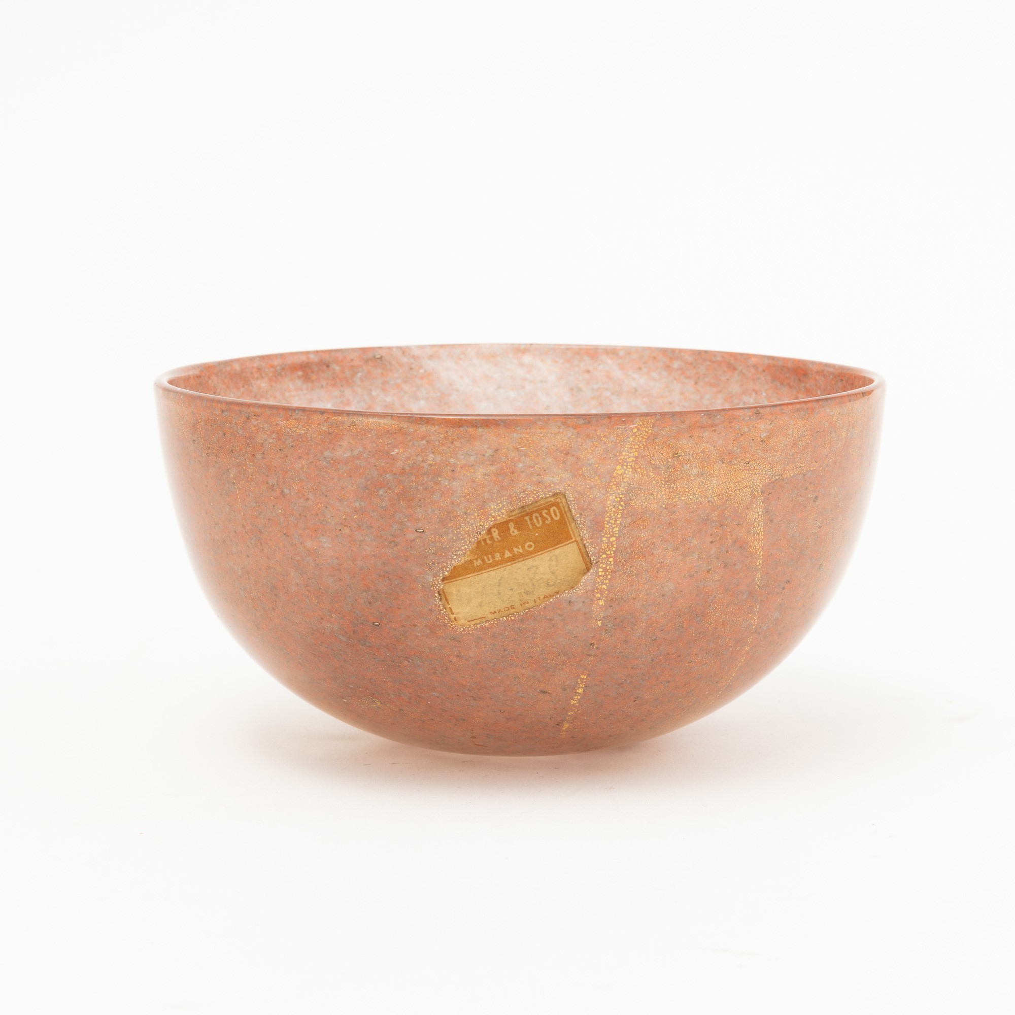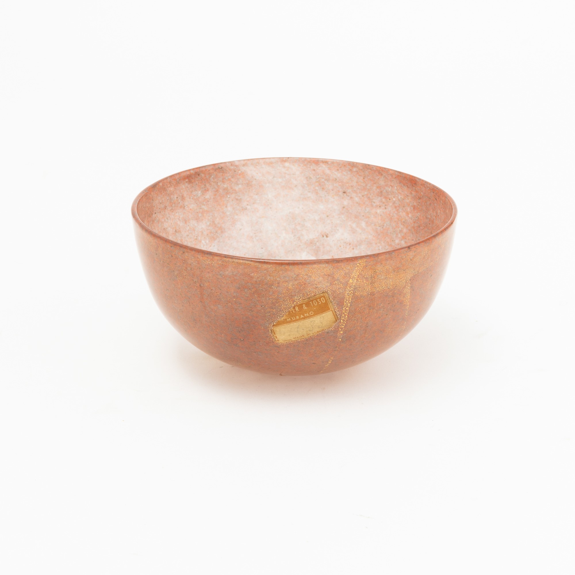 Coppa semisferica in vetro soffiato con decoro di polveri policrome e foglia oro.