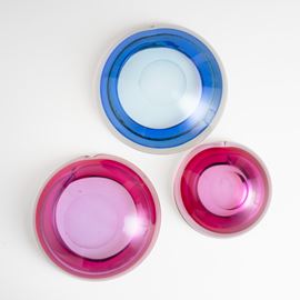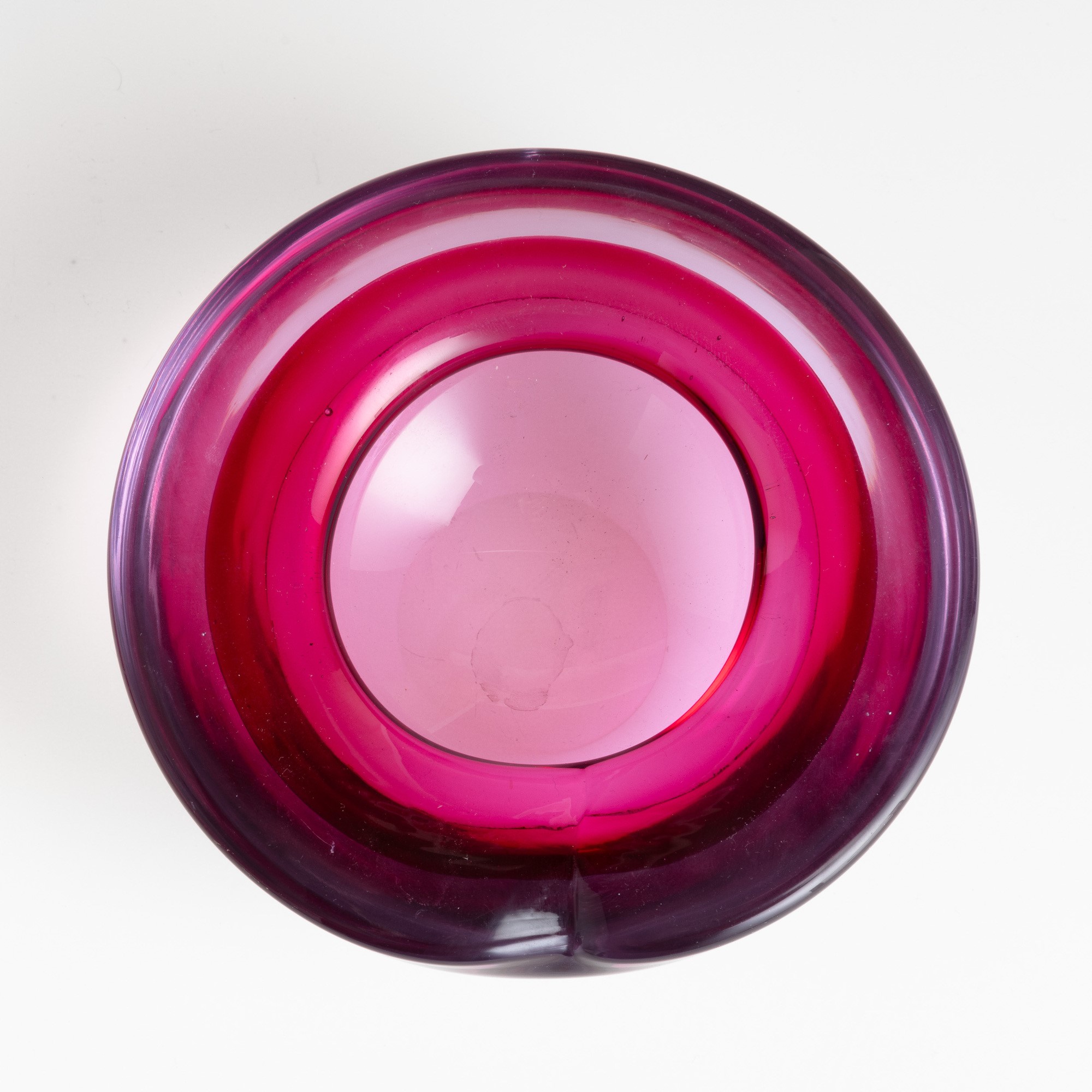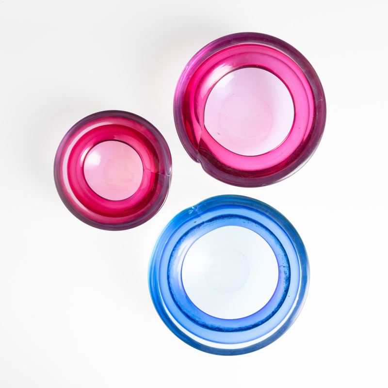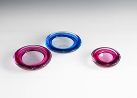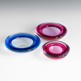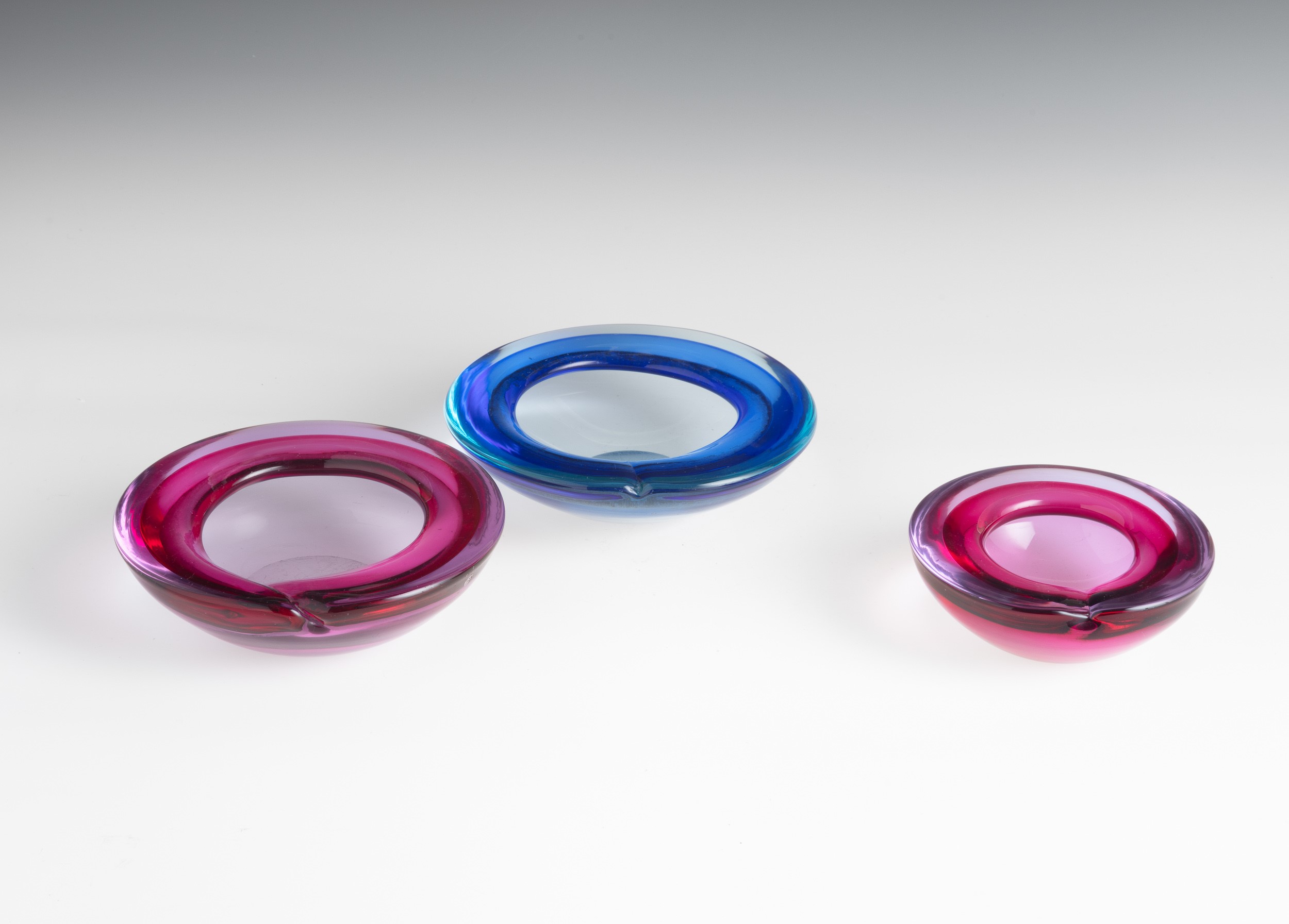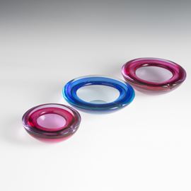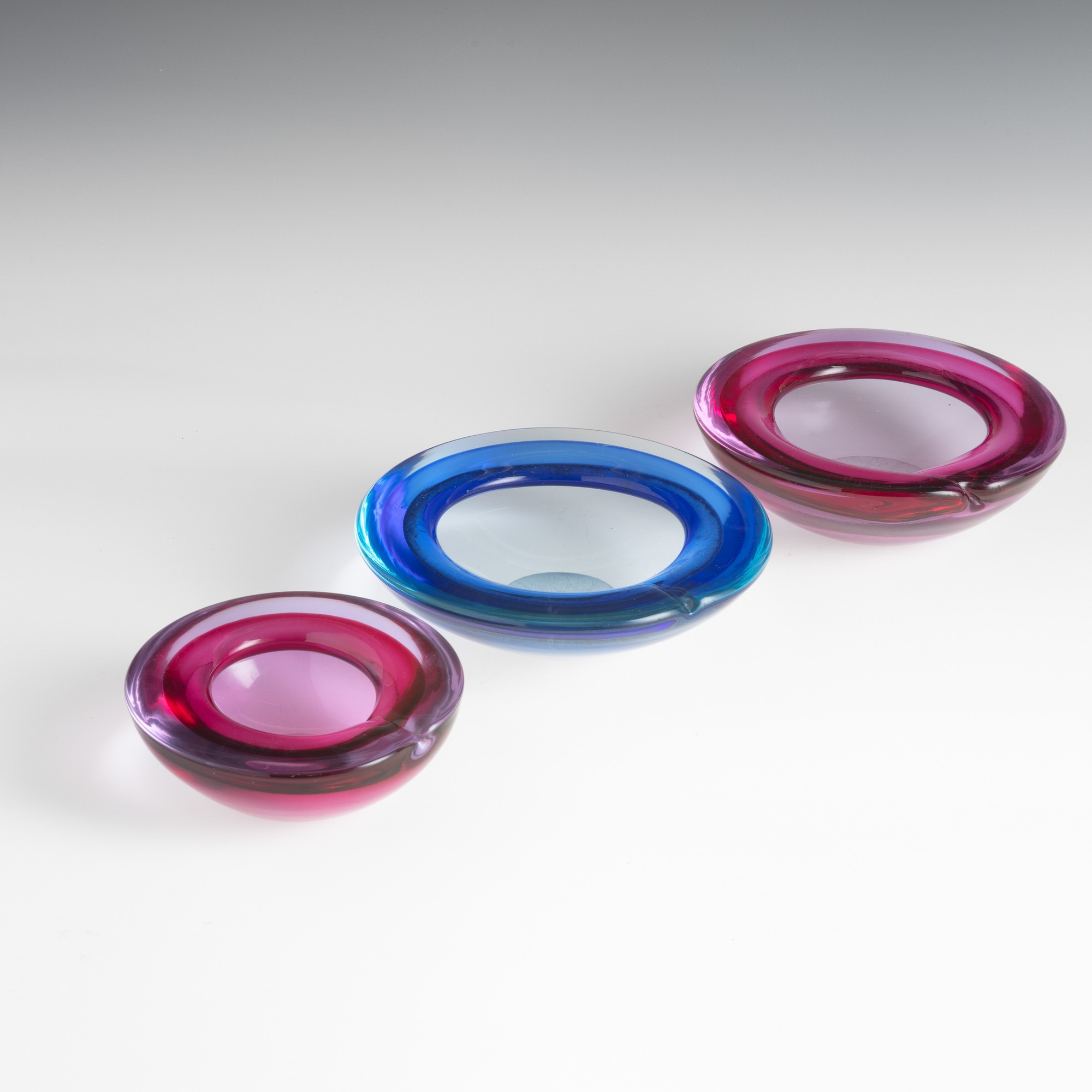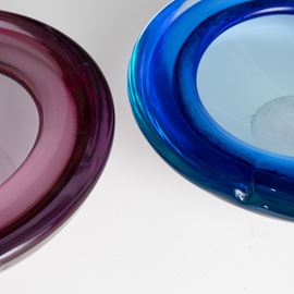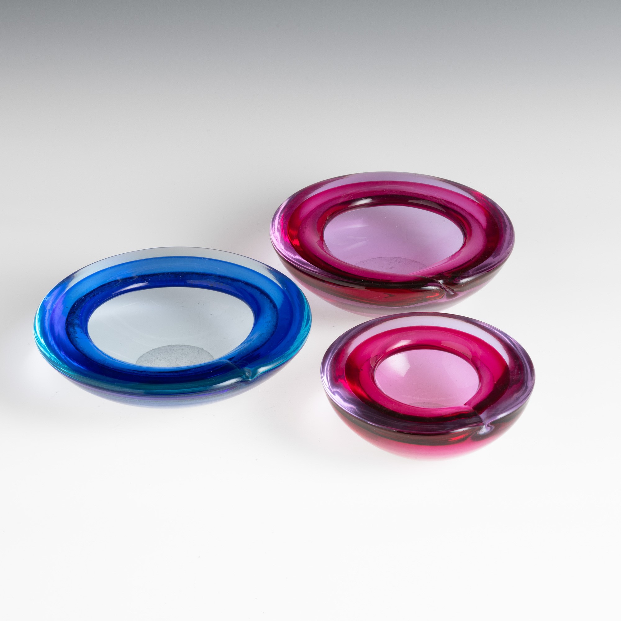 Lotto di tre posacenere in vetro sommerso a due colori.