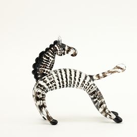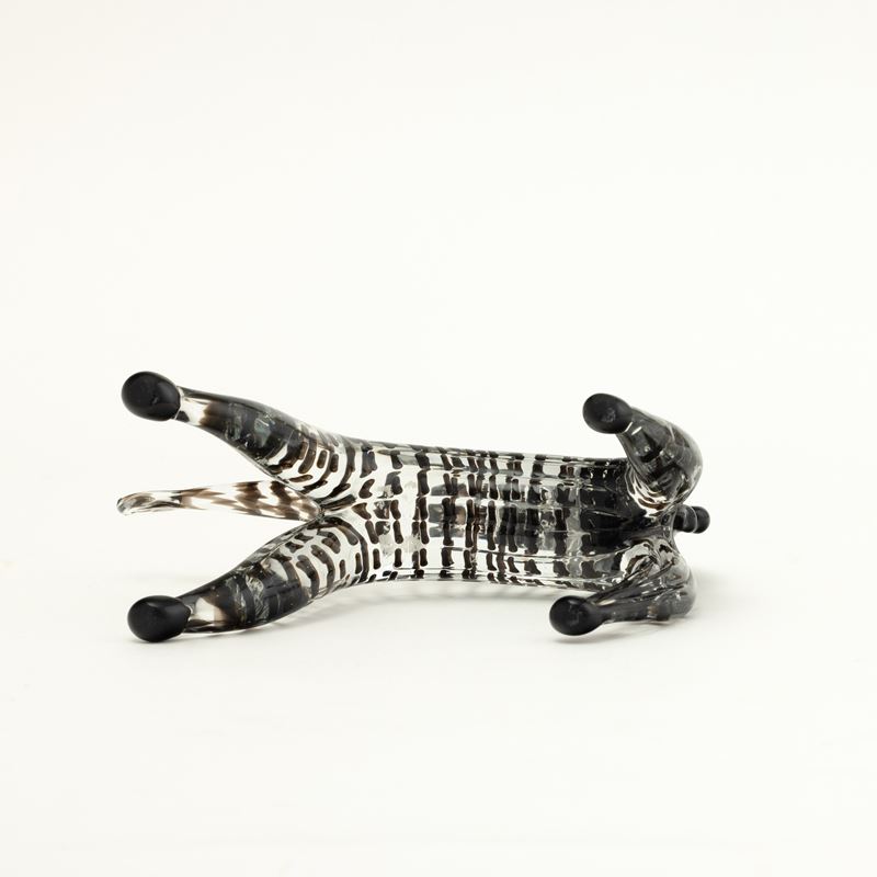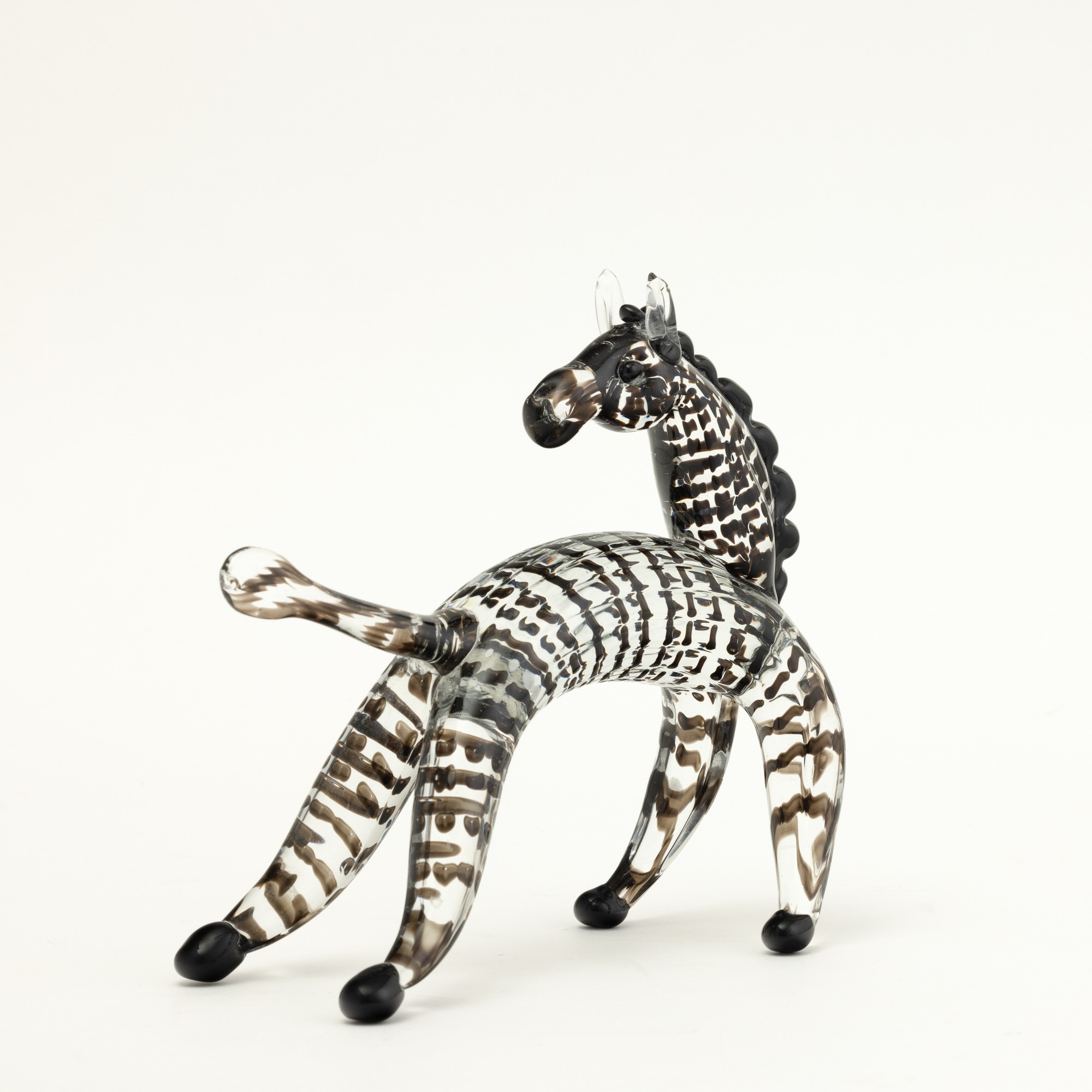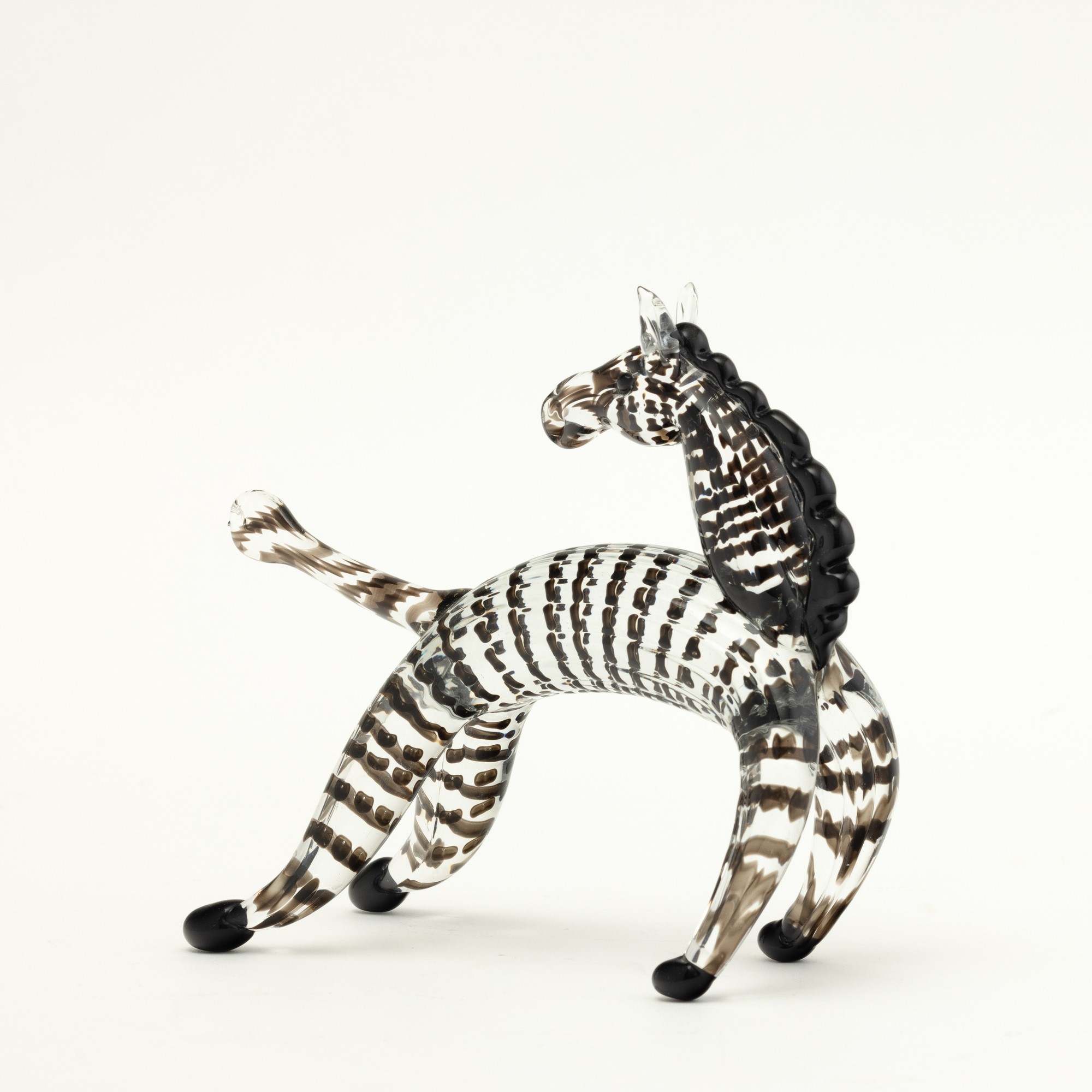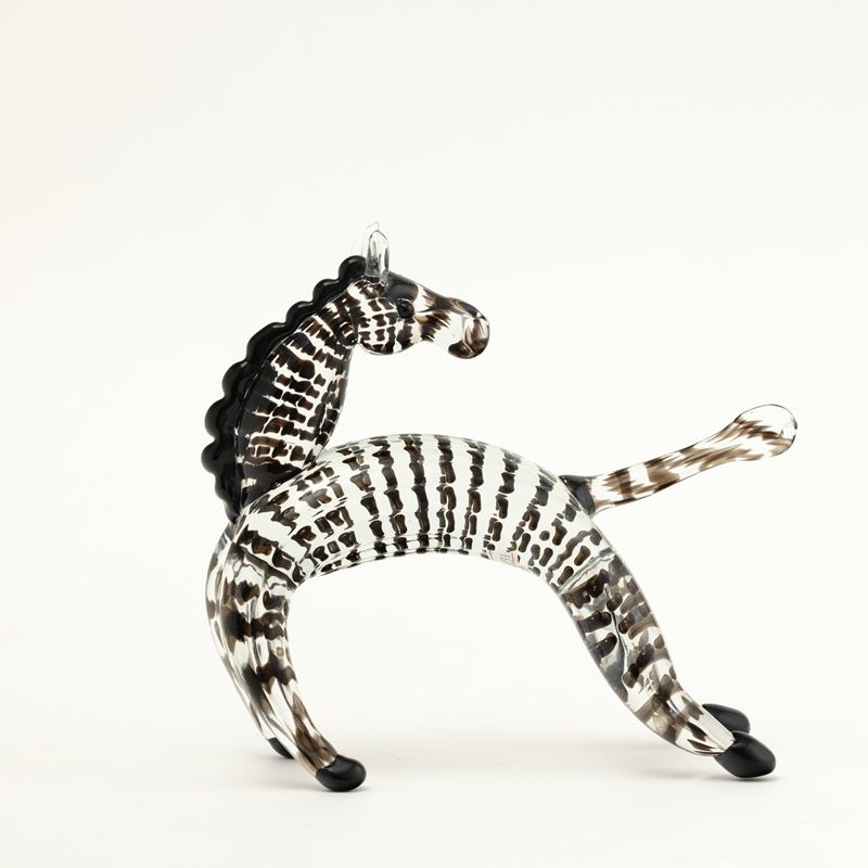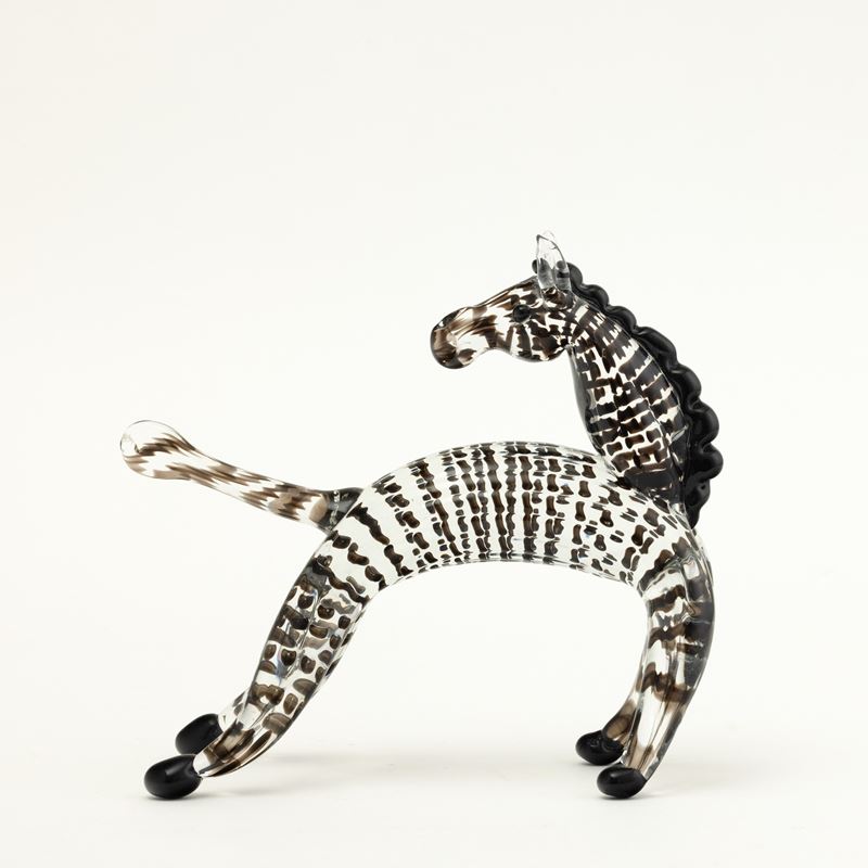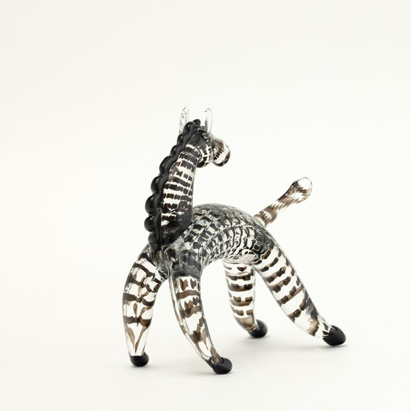 Zebra in vetro cristallo con decoro di canne orizzontali e applicazioni di cresta e zampe in pasta vitrea nera.