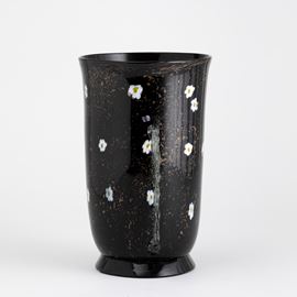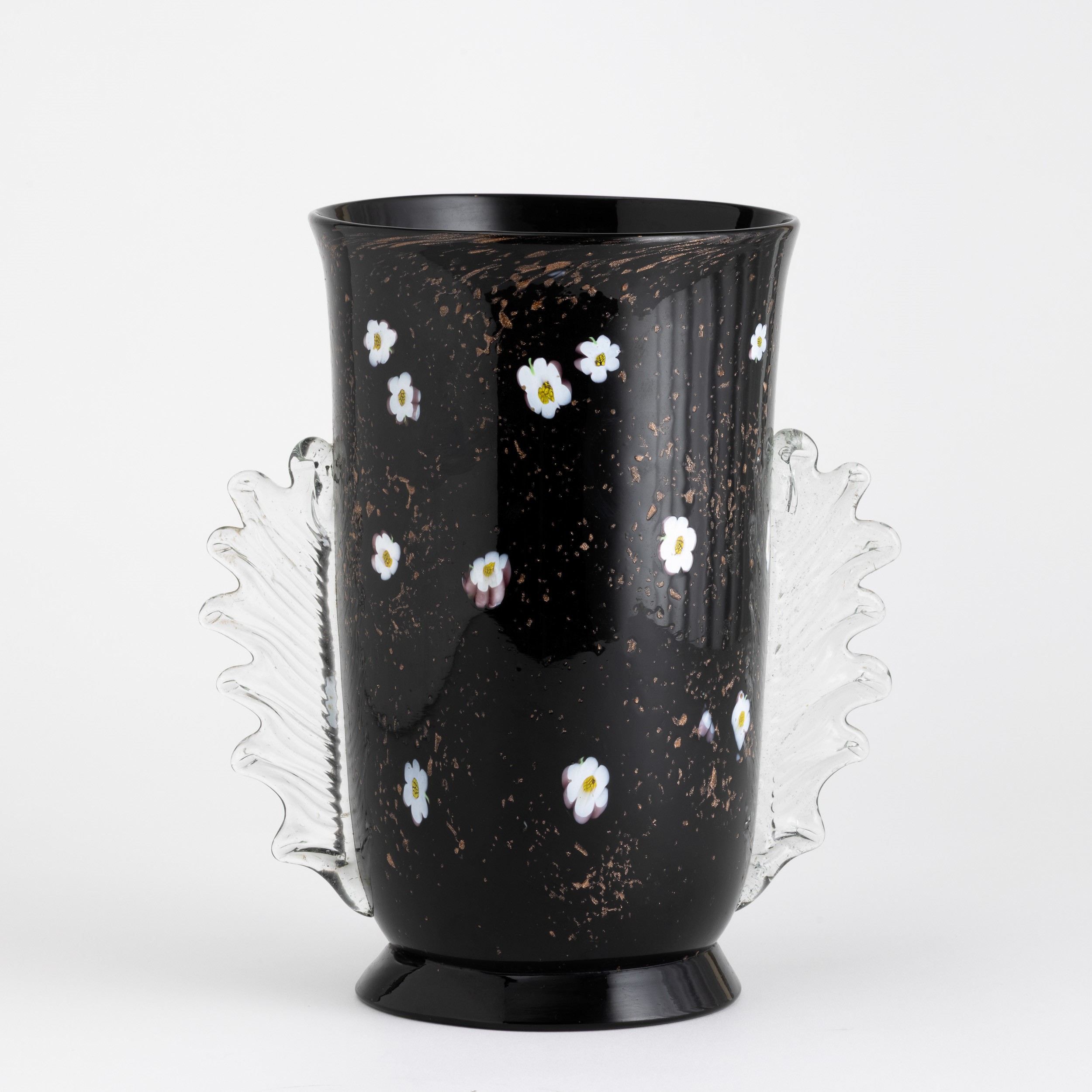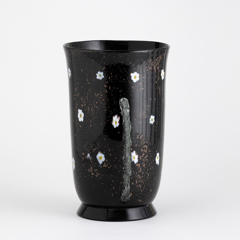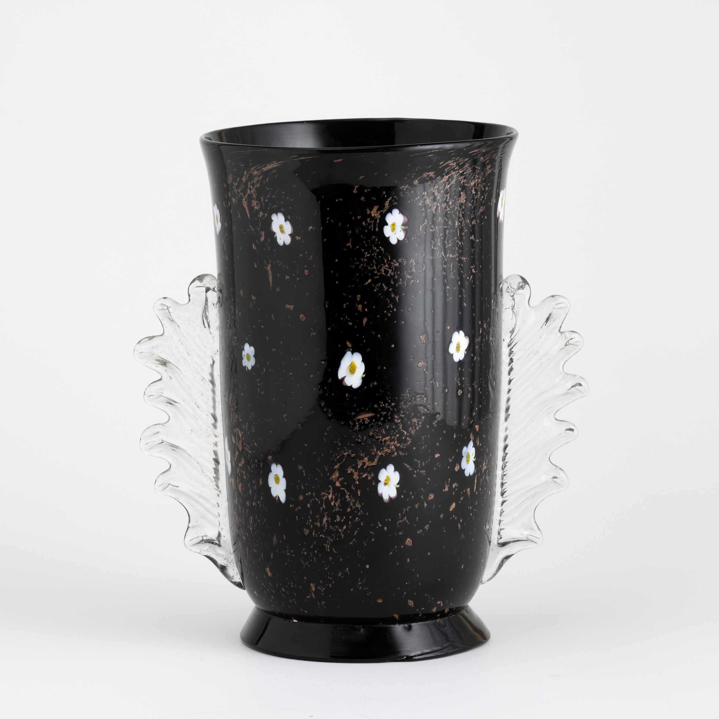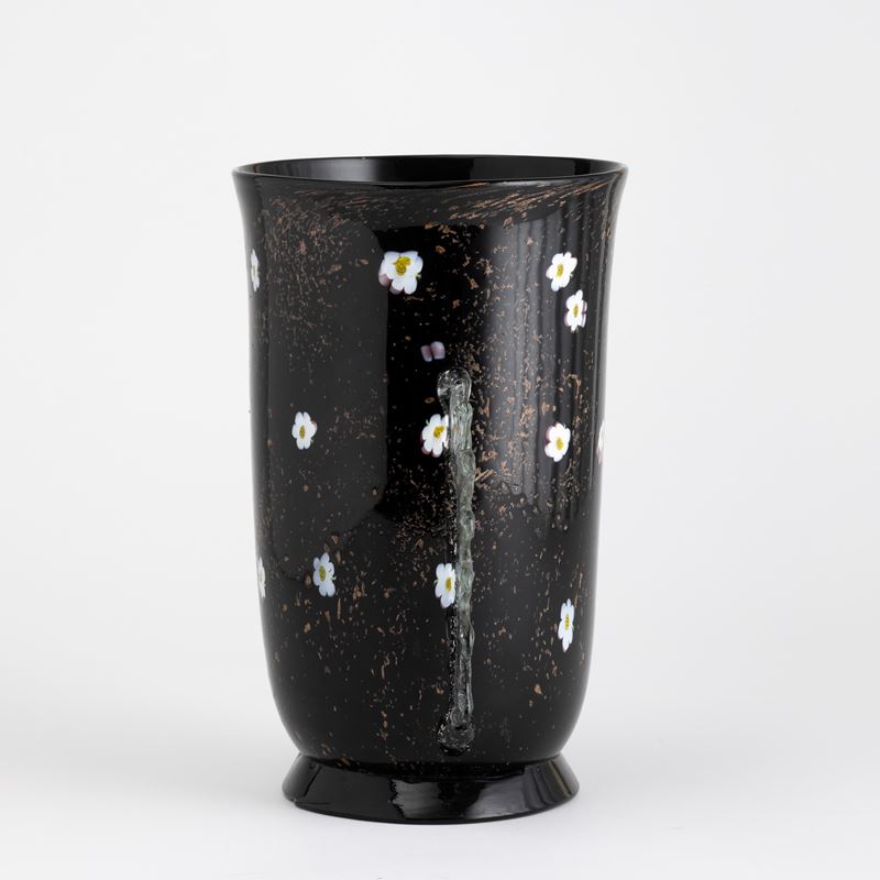 Vaso a campana su piede troncoconico in vetro soffiato con decoro di polvere di avventurina e murrine floreali.